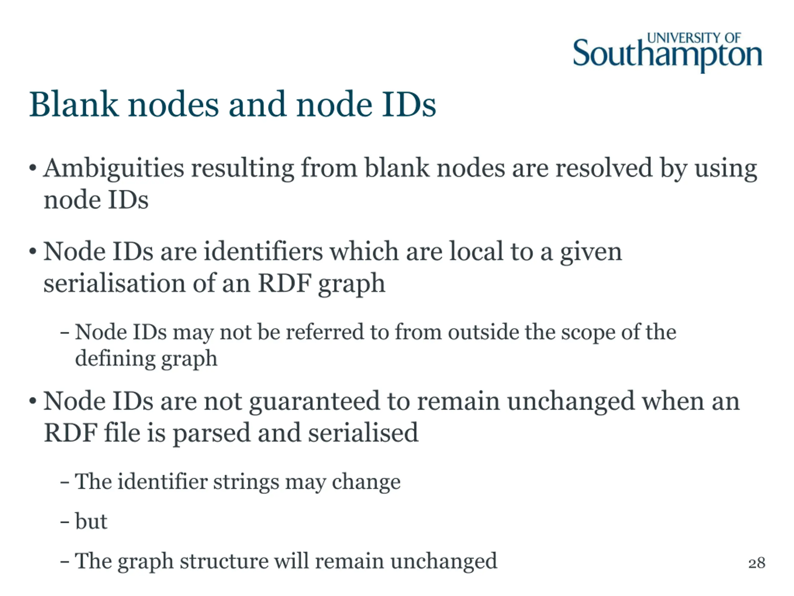 Blank nodes and node IDs Ambiguities resulting from blank nodes are resolved by using node IDs Node IDs are identifiers which are local to a given serialisation of an RDF graph Node IDs may not be referred to from outside the scope of the defining graph Node IDs are not guaranteed to remain unchanged when an RDF file is parsed and serialised The identifier strings may change but The graph structure will remain unchanged 28