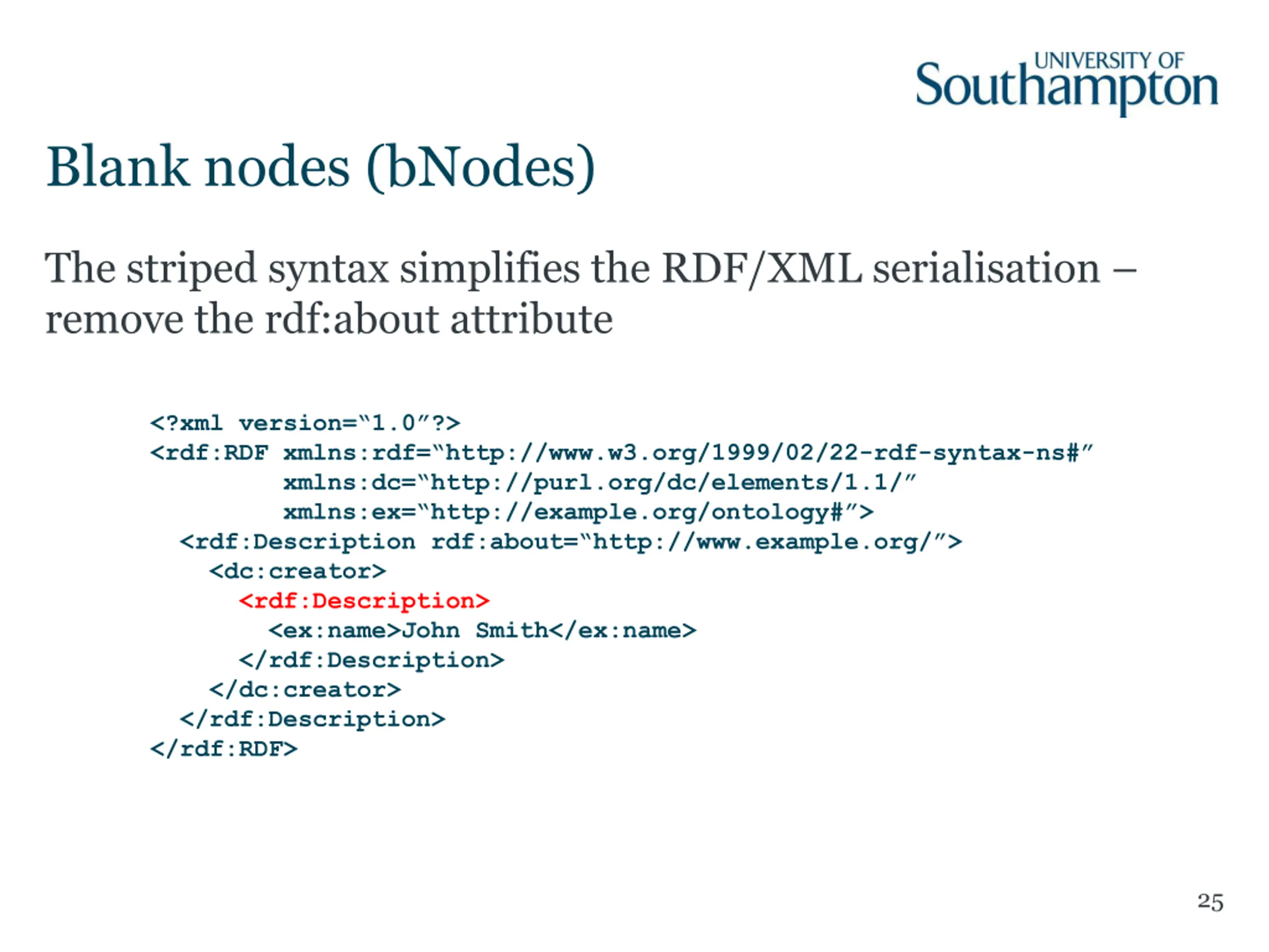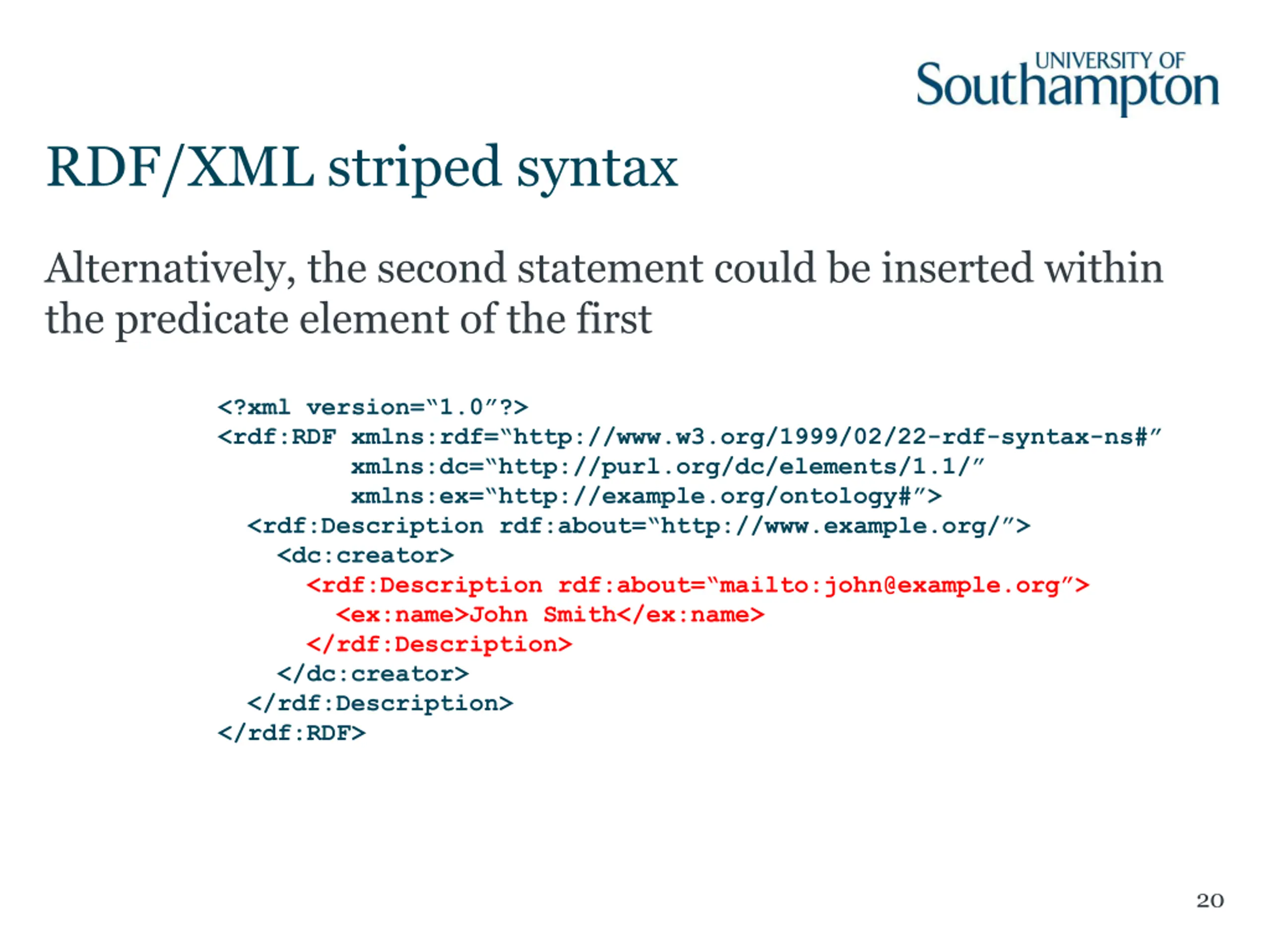 RDF/XML striped syntax Alternatively, the second statement could be inserted within the predicate element of the first <?xml version= 1.0 ?> <rdf:RDF xmlns:rdf= http://www.w3.org/1999/02/22-rdf-syntax-ns# xmlns:dc= http://purl.org/dc/elements/1.1/ xmlns:ex= http://example.org/ontology# > <rdf:Description rdf:about= http://www.example.org/ > <dc:creator> <rdf:Description rdf:about= mailto:john@example.org > <ex:name>John Smith</ex:name> </rdf:Description> </dc:creator> </rdf:Description> </rdf:RDF> 20