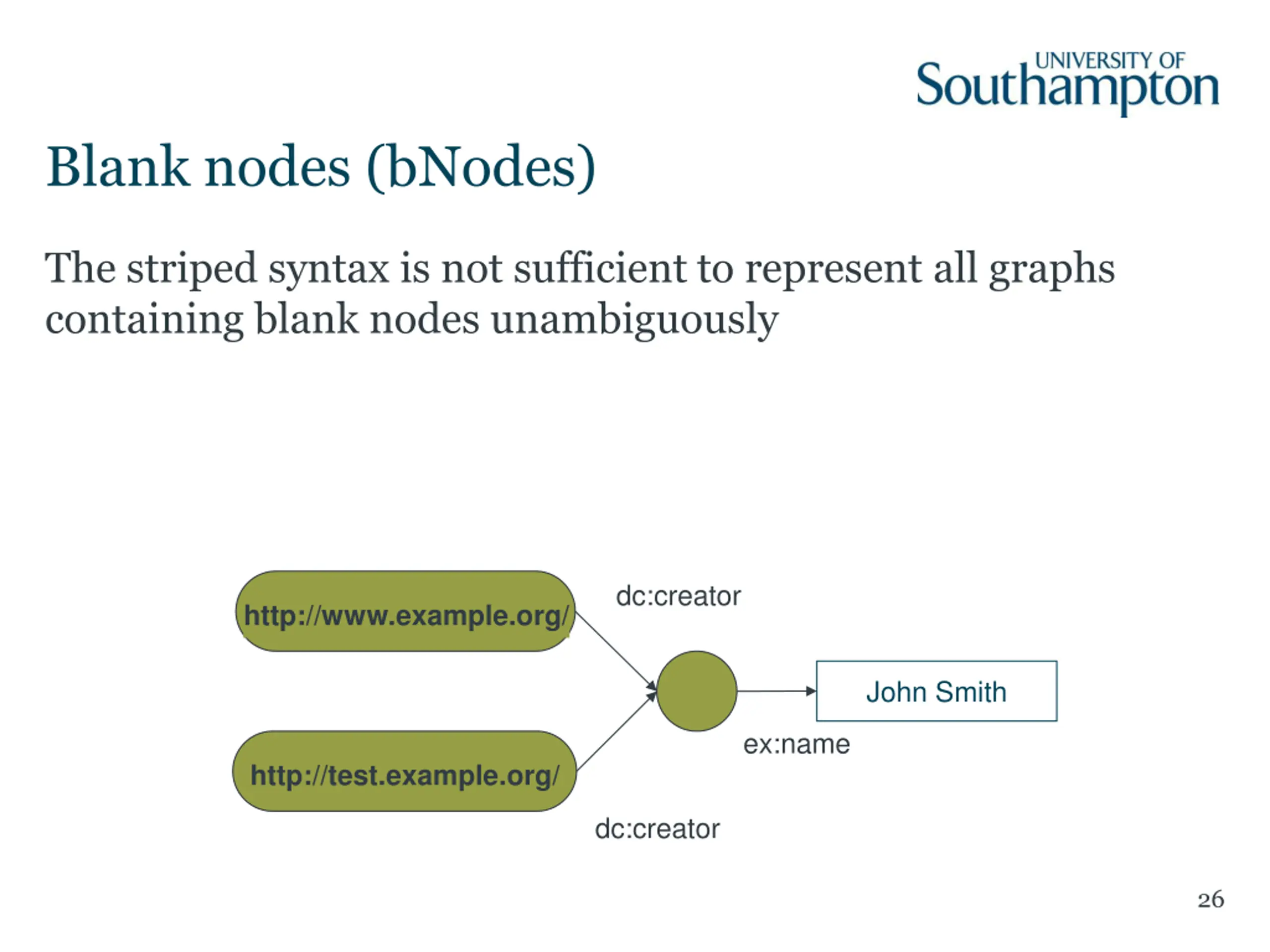 Blank nodes (bNodes) The striped syntax simplifies the RDF/XML serialisation remove the rdf:about attribute <?xml version= 1.0 ?> <rdf:RDF xmlns:rdf= http://www.w3.org/1999/02/22-rdf-syntax-ns# xmlns:dc= http://purl.org/dc/elements/1.1/ xmlns:ex= http://example.org/ontology# > <rdf:Description rdf:about= http://www.example.org/ > <dc:creator> <rdf:Description> <ex:name>John Smith</ex:name> </rdf:Description> </dc:creator> </rdf:Description> </rdf:RDF> 25
