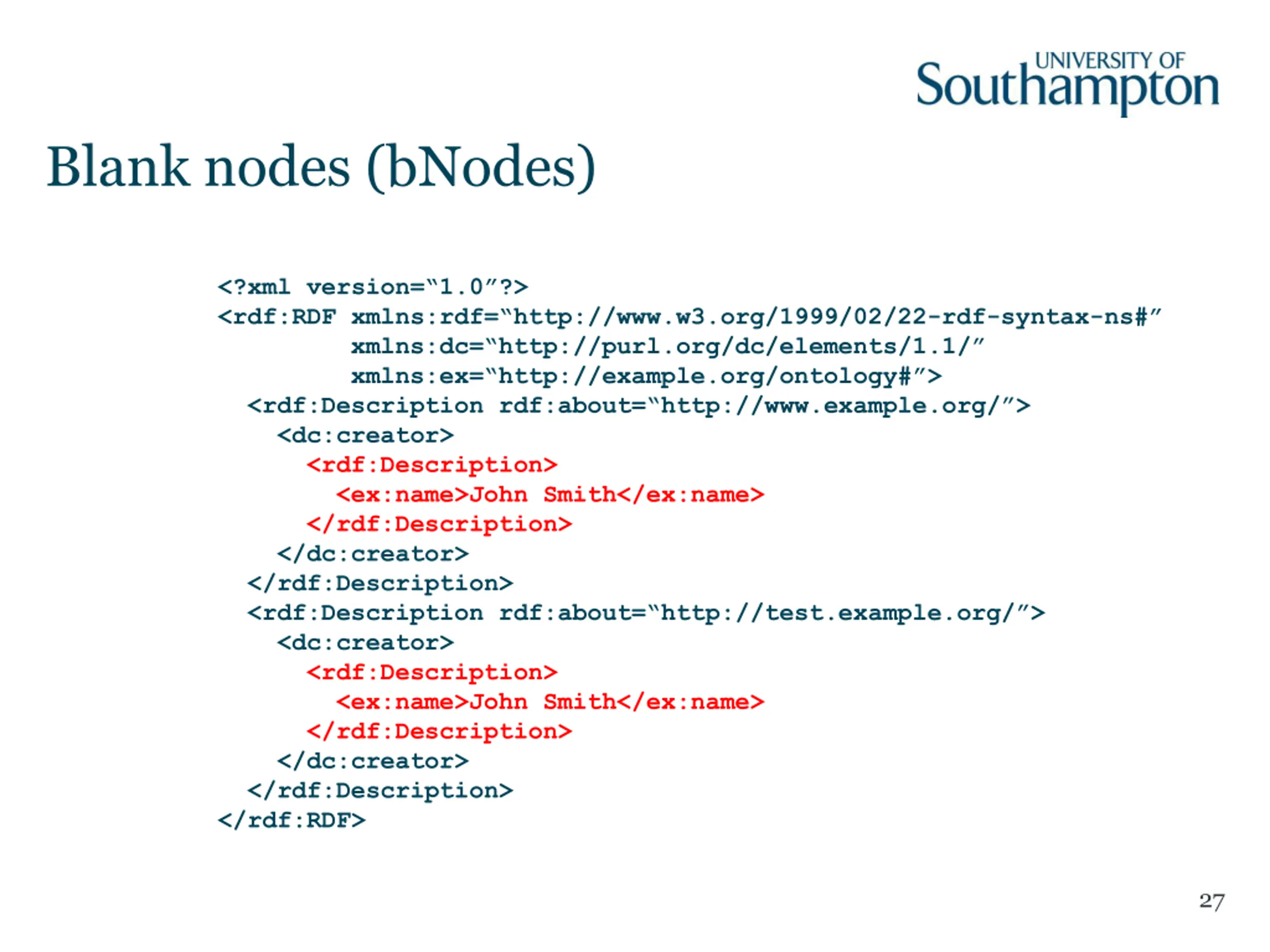 Blank nodes (bNodes) <?xml version= 1.0 ?> <rdf:RDF xmlns:rdf= http://www.w3.org/1999/02/22-rdf-syntax-ns# xmlns:dc= http://purl.org/dc/elements/1.1/ xmlns:ex= http://example.org/ontology# > <rdf:Description rdf:about= http://www.example.org/ > <dc:creator> <rdf:Description> <ex:name>John Smith</ex:name> </rdf:Description> </dc:creator> </rdf:Description> <rdf:Description rdf:about= http://test.example.org/ > <dc:creator> <rdf:Description> <ex:name>John Smith</ex:name> </rdf:Description> </dc:creator> </rdf:Description> </rdf:RDF> 27