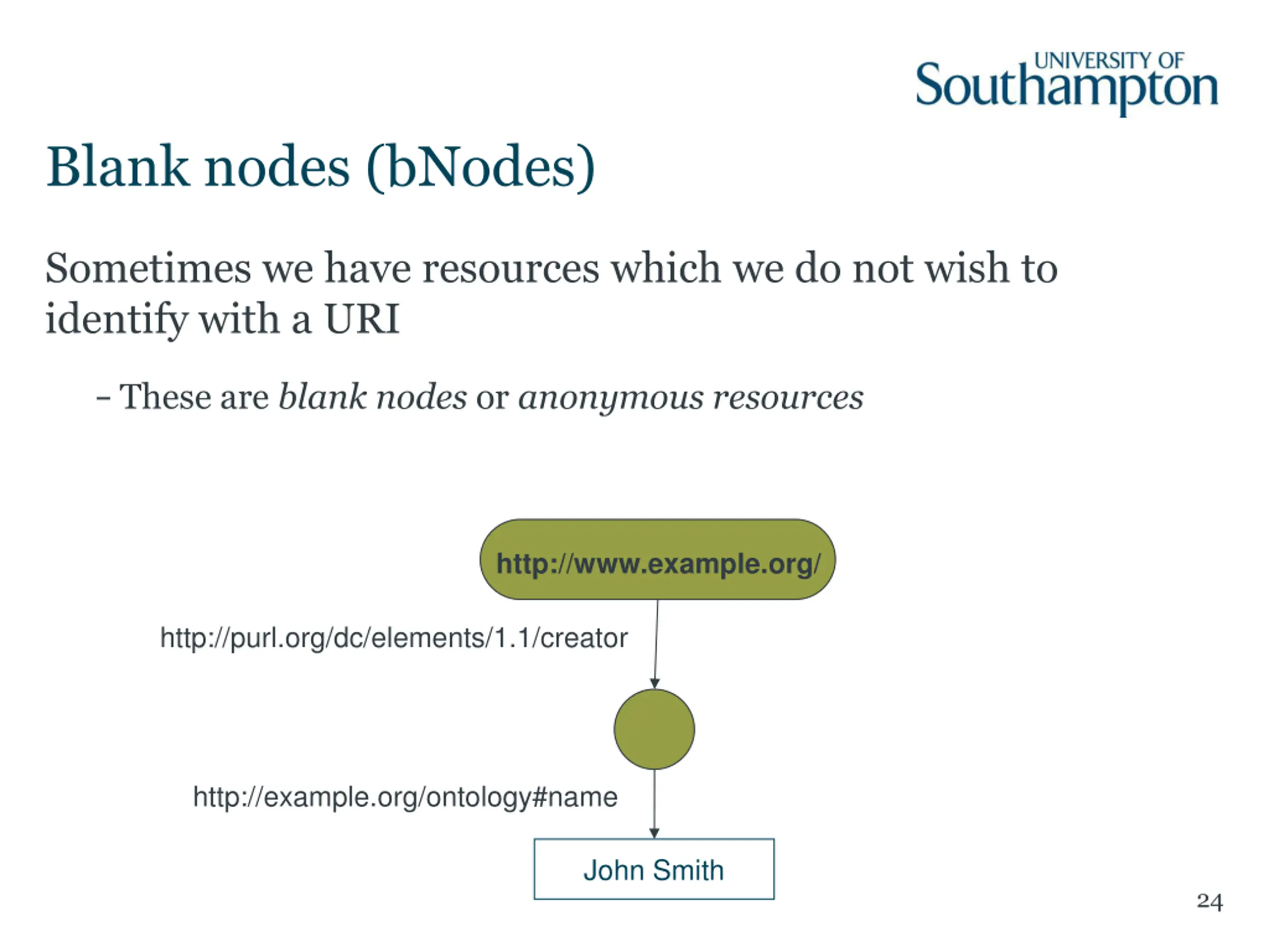 Blank nodes (bNodes) Sometimes we have resources which we do not wish to identify with a URI These are blank nodes or anonymous resources http://www.example.org/ http://purl.org/dc/elements/1.1/creator http://example.org/ontology#name John Smith 24