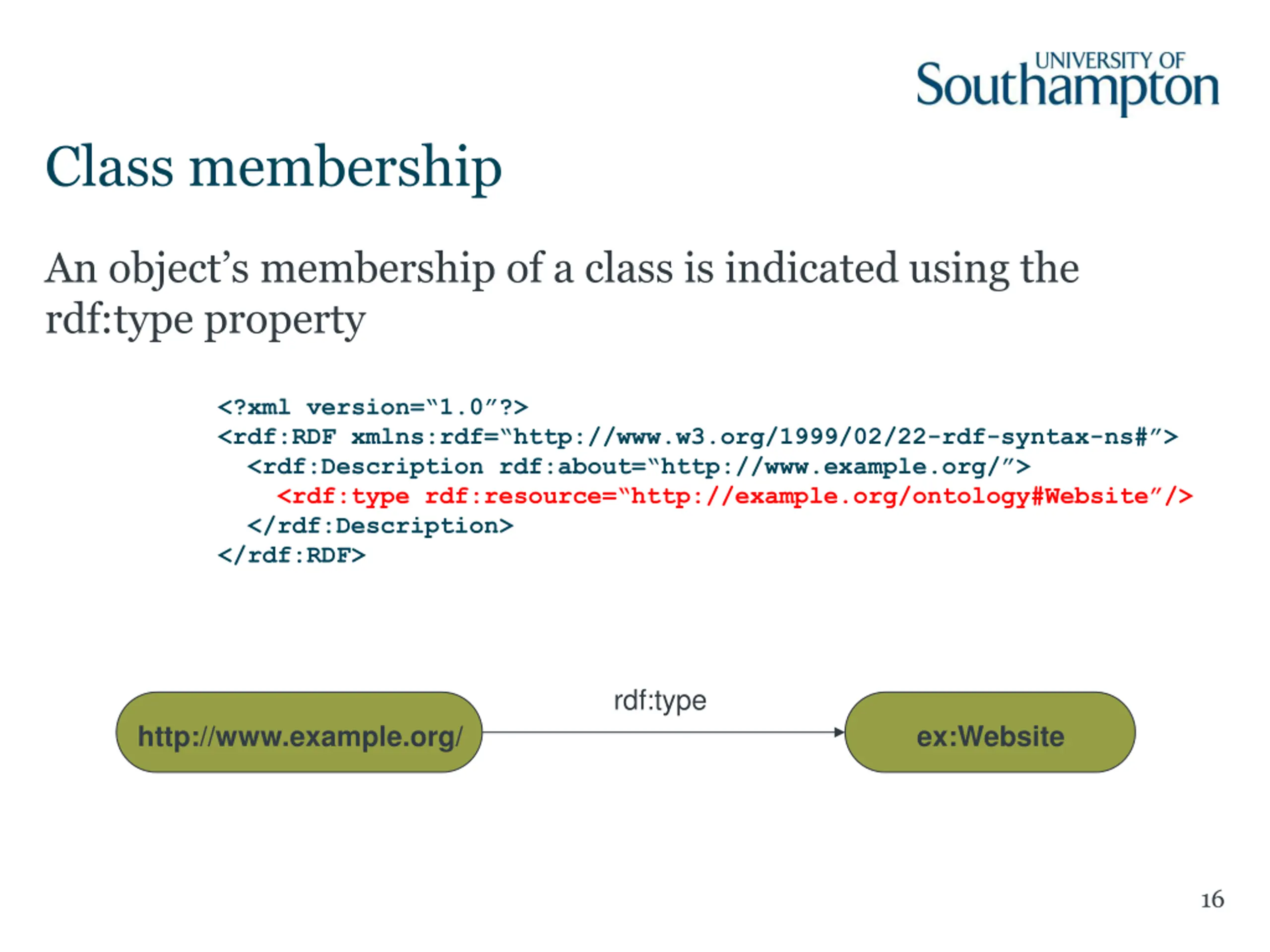 Class membership An object s membership of a class is indicated using the rdf:type property <?xml version= 1.0 ?> <rdf:RDF xmlns:rdf= http://www.w3.org/1999/02/22-rdf-syntax-ns# > <rdf:Description rdf:about= http://www.example.org/ > <rdf:type rdf:resource= http://example.org/ontology#Website /> </rdf:Description> </rdf:RDF> rdf:type http://www.example.org/ ex:Website 16