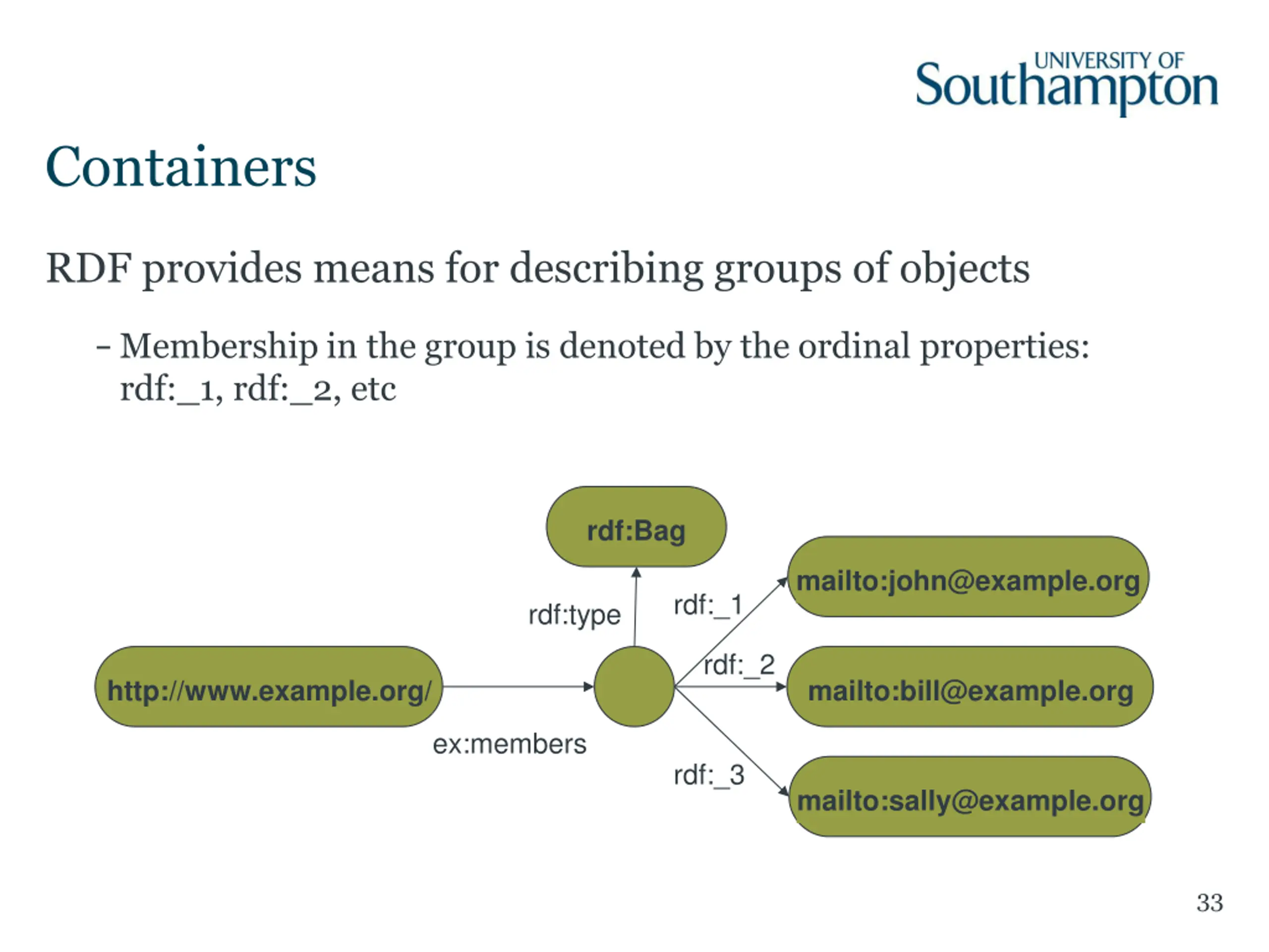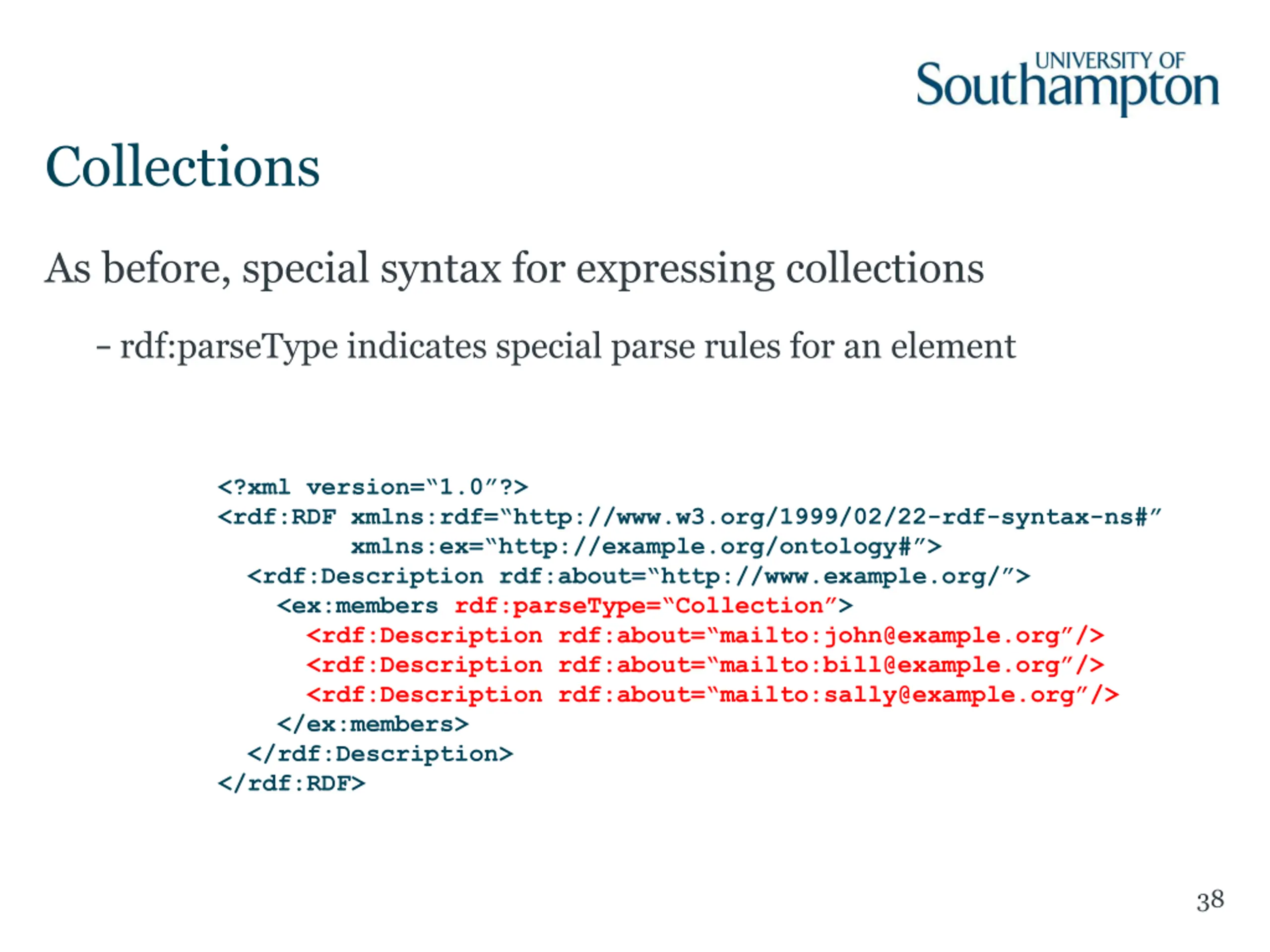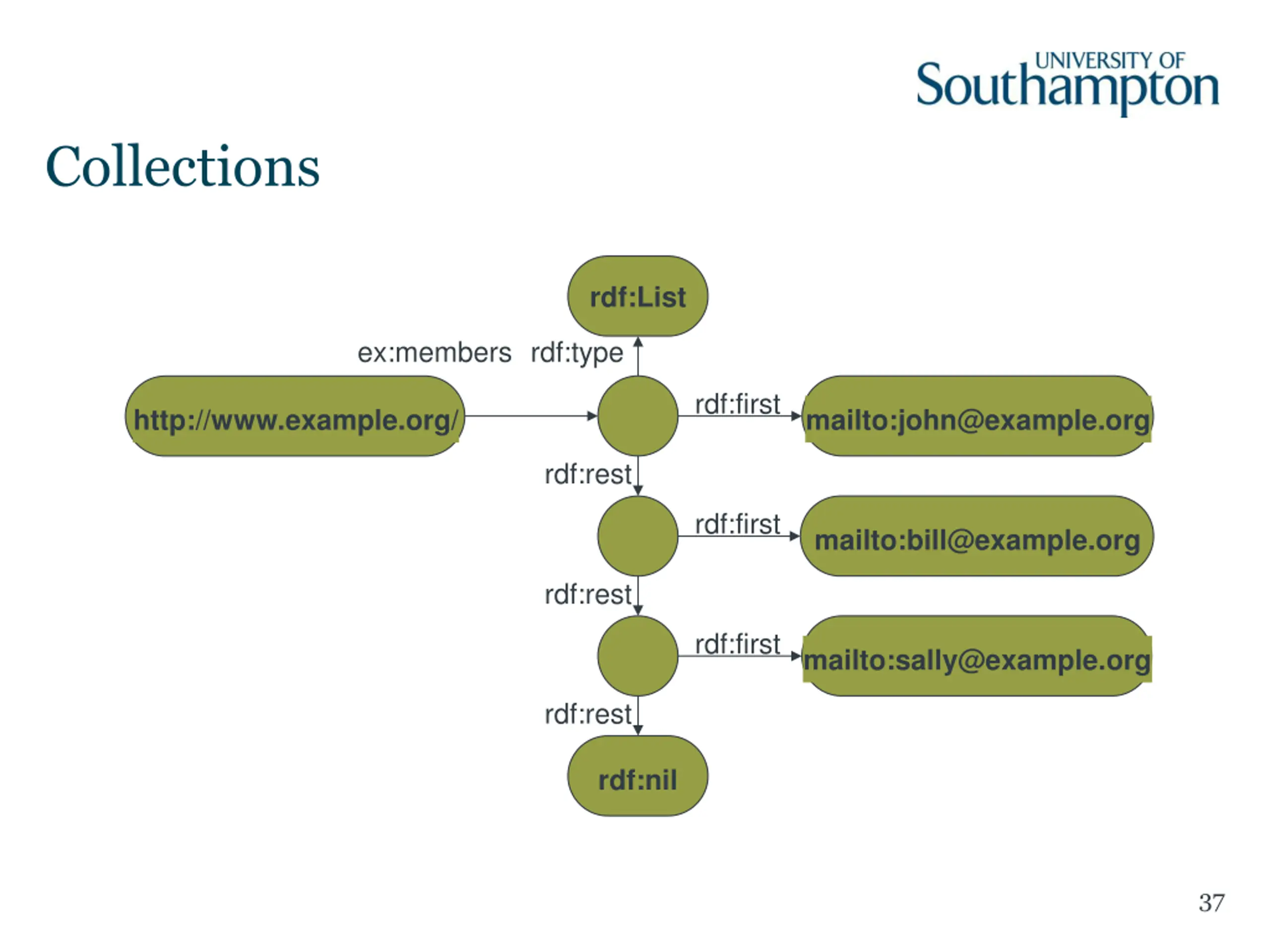 Collections rdf:List ex:members rdf:type rdf:first mailto:john@example.org http://www.example.org/ rdf:rest rdf:first mailto:bill@example.org rdf:rest rdf:first mailto:sally@example.org rdf:rest rdf:nil 37