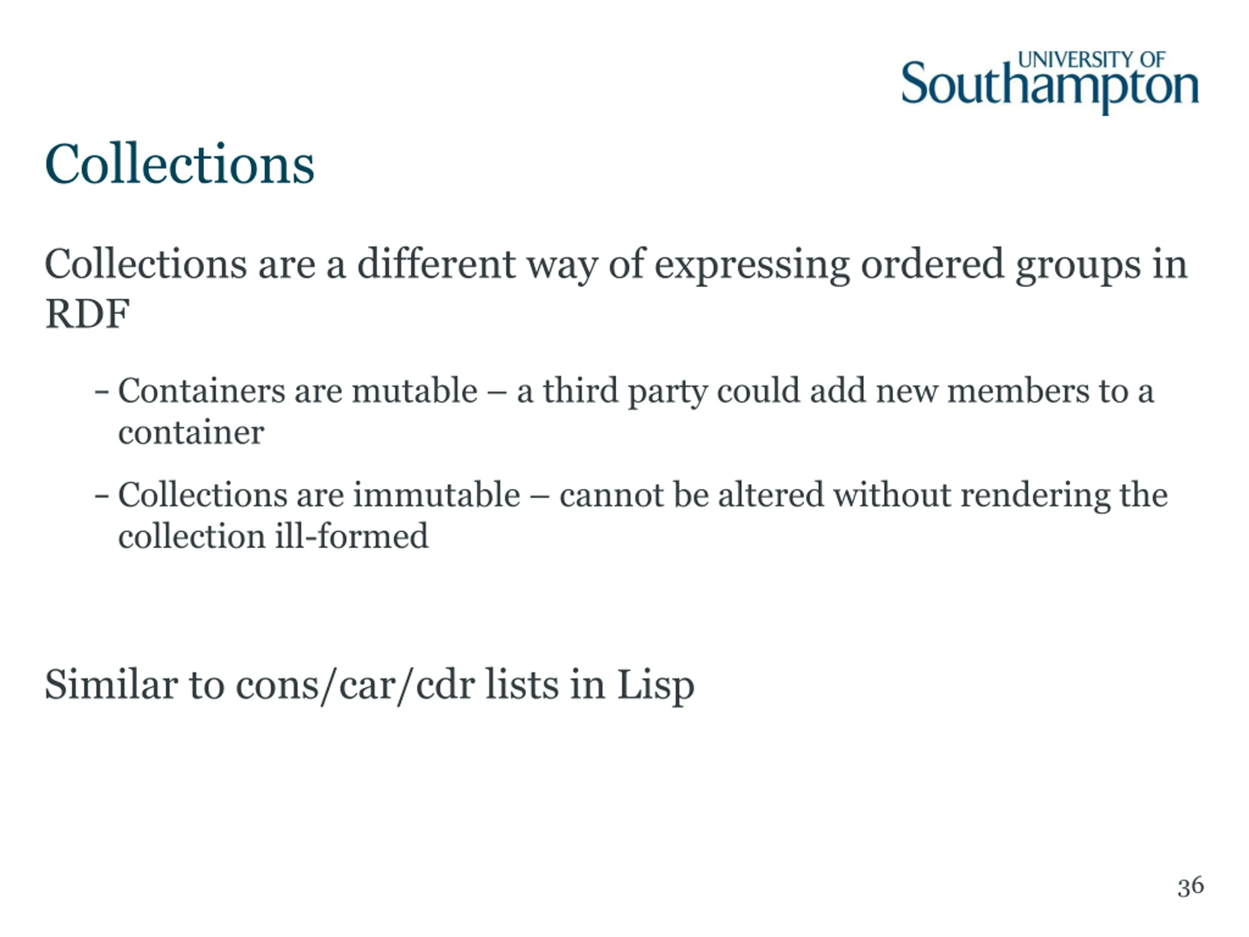 Collections Collections are a different way of expressing ordered groups in RDF Containers are mutable a third party could add new members to a container Collections are immutable cannot be altered without rendering the collection ill-formed Similar to cons/car/cdr lists in Lisp 36