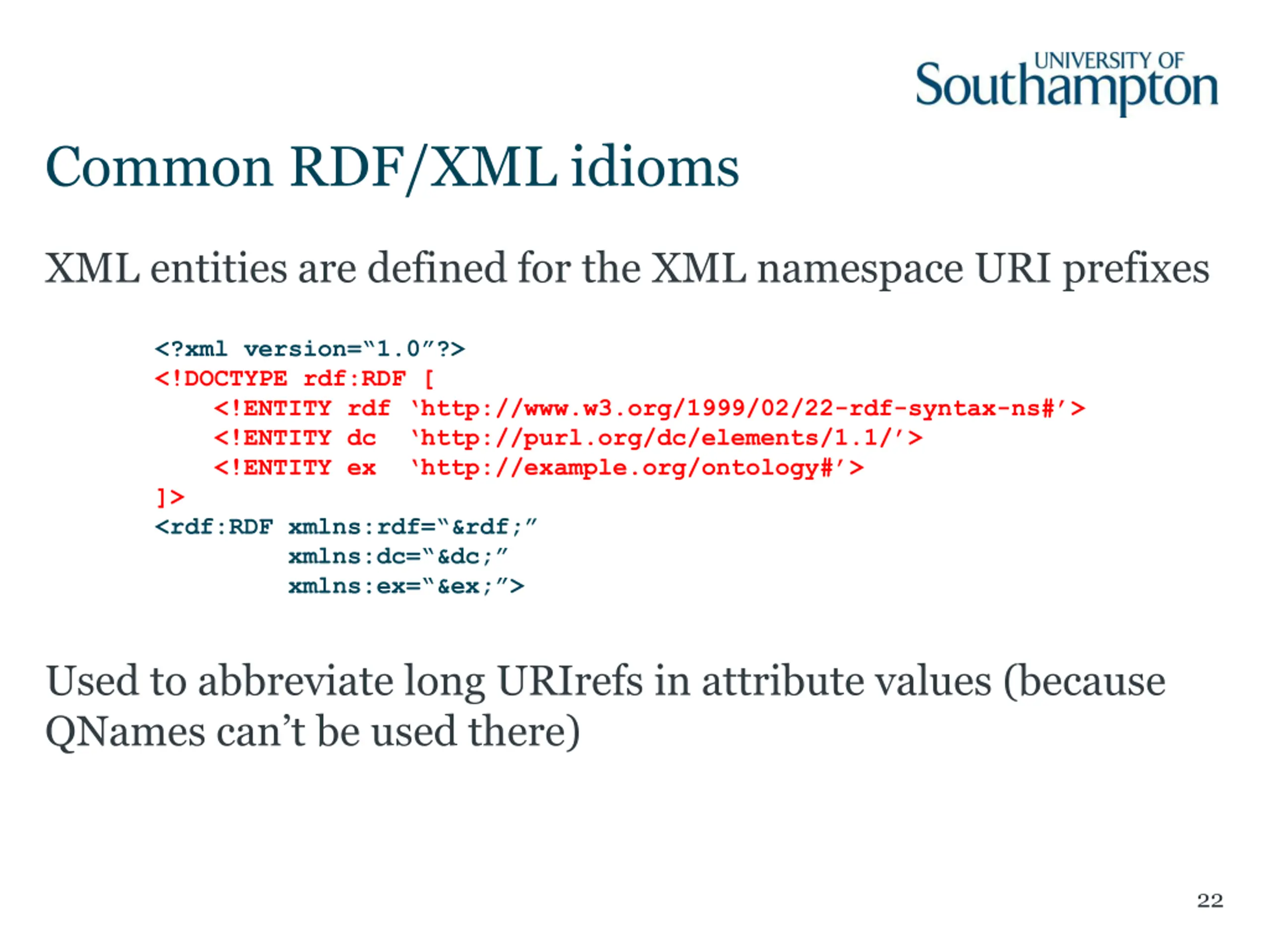 Common RDF/XML idioms XML entities are defined for the XML namespace URI prefixes <?xml version= 1.0 ?> <!DOCTYPE rdf:RDF [ <!ENTITY rdf http://www.w3.org/1999/02/22-rdf-syntax-ns# > <!ENTITY dc http://purl.org/dc/elements/1.1/ > <!ENTITY ex http://example.org/ontology# > ]> <rdf:RDF xmlns:rdf= &rdf; xmlns:dc= &dc; xmlns:ex= &ex; > Used to abbreviate long URIrefs in attribute values (because QNames can t be used there) 22