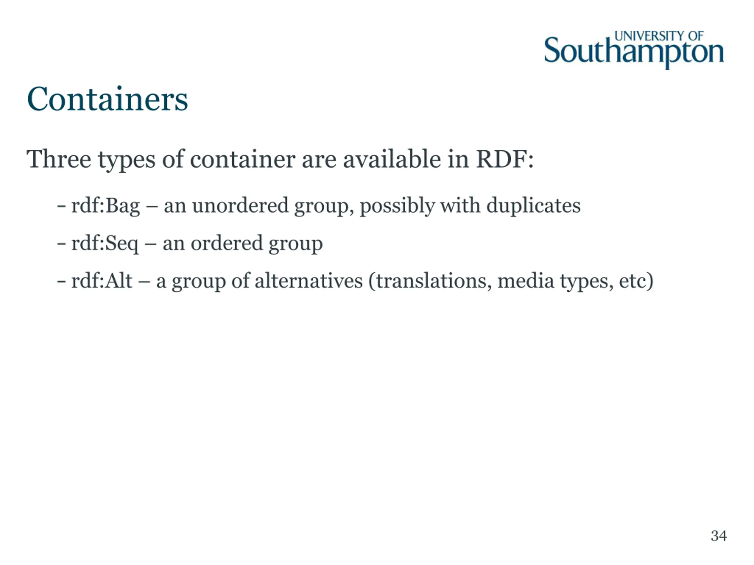 Containers RDF provides means for describing groups of objects Membership in the group is denoted by the ordinal properties: rdf:_1, rdf:_2, etc rdf:Bag mailto:john@example.org rdf:_1 rdf:type rdf:_2 http://www.example.org/ mailto:bill@example.org ex:members rdf:_3 mailto:sally@example.org 33