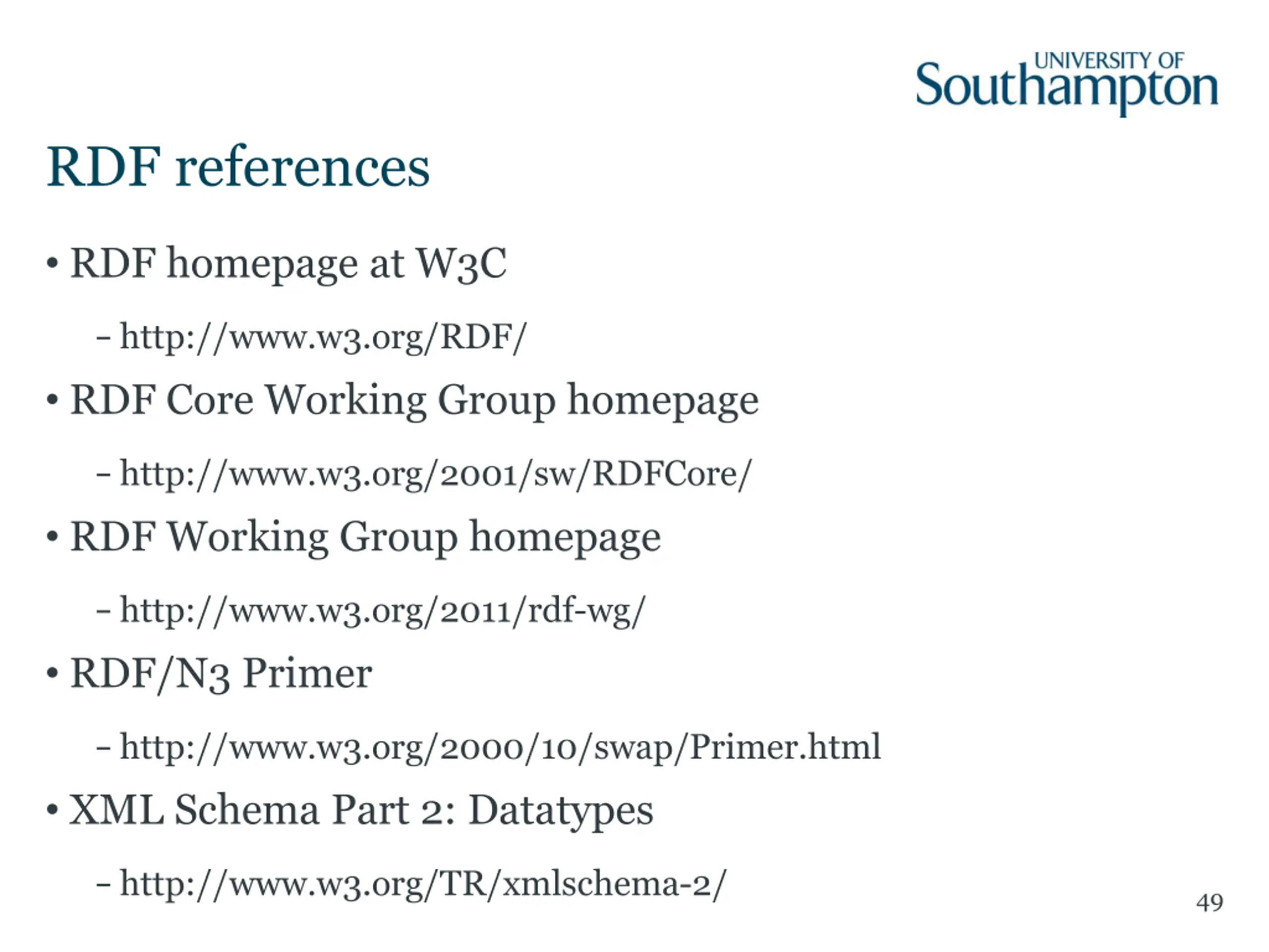 RDF references RDF homepage at W3C http://www.w3.org/RDF/ RDF Core Working Group homepage http://www.w3.org/2001/sw/RDFCore/ RDF Working Group homepage http://www.w3.org/2011/rdf-wg/ RDF/N3 Primer http://www.w3.org/2000/10/swap/Primer.html XML Schema Part 2: Datatypes http://www.w3.org/TR/xmlschema-2/ 49