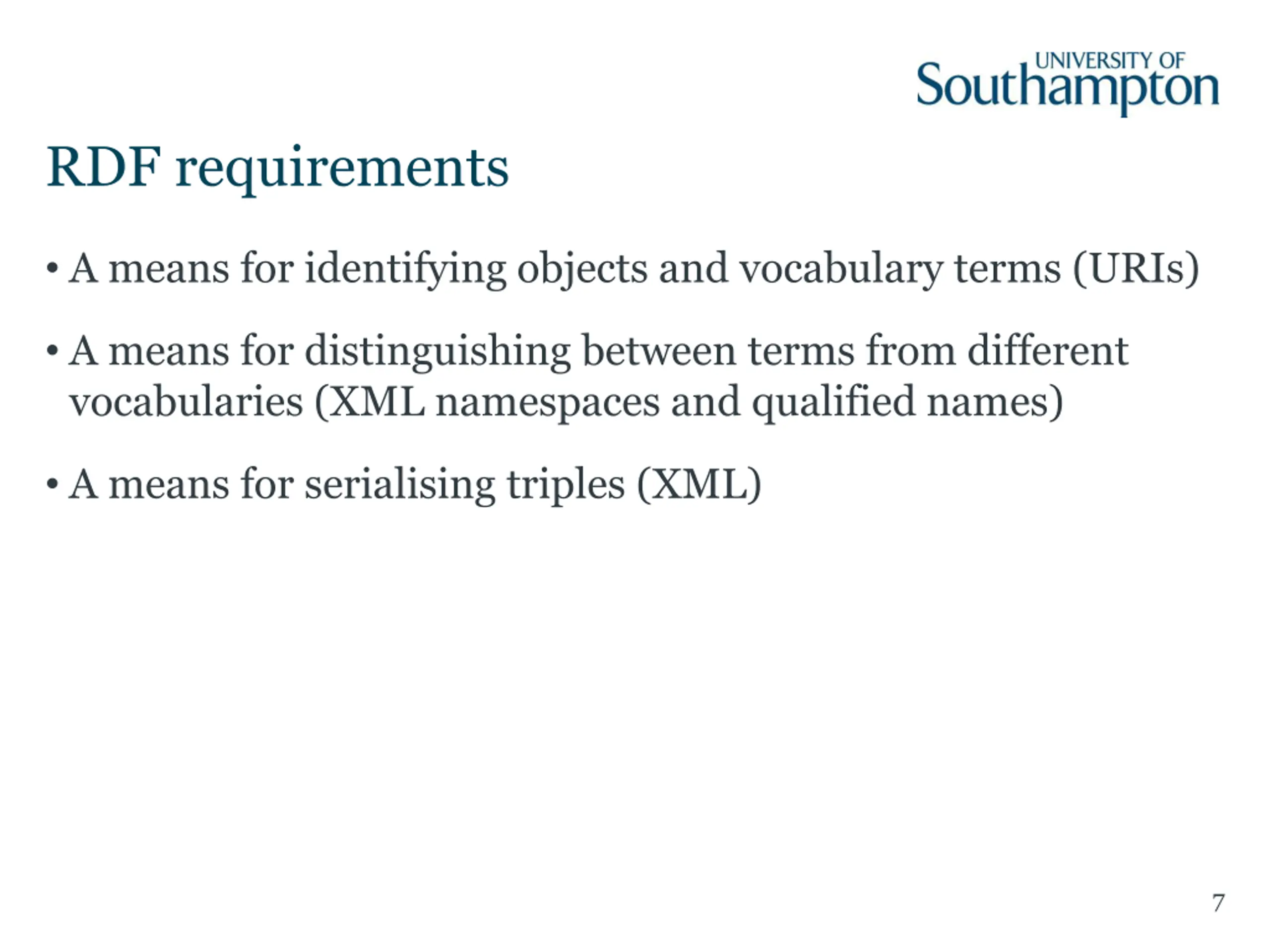 RDF requirements A means for identifying objects and vocabulary terms (URIs) A means for distinguishing between terms from different vocabularies (XML namespaces and qualified names) A means for serialising triples (XML) 7