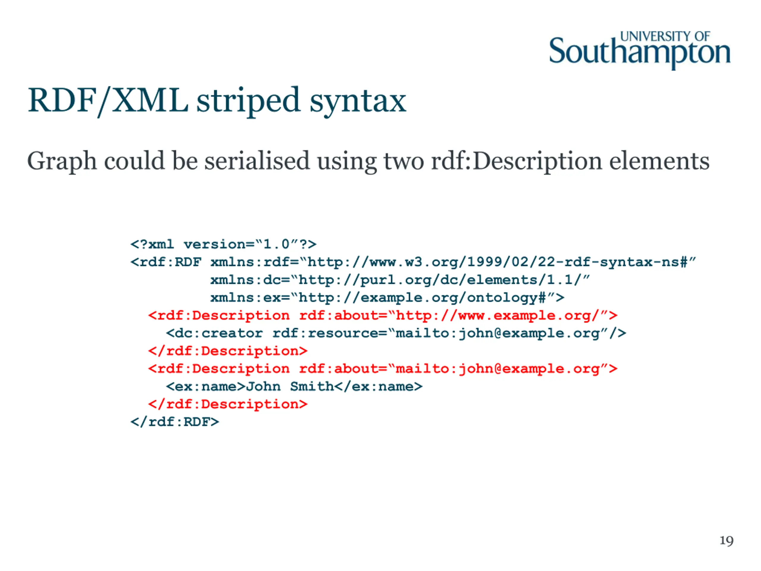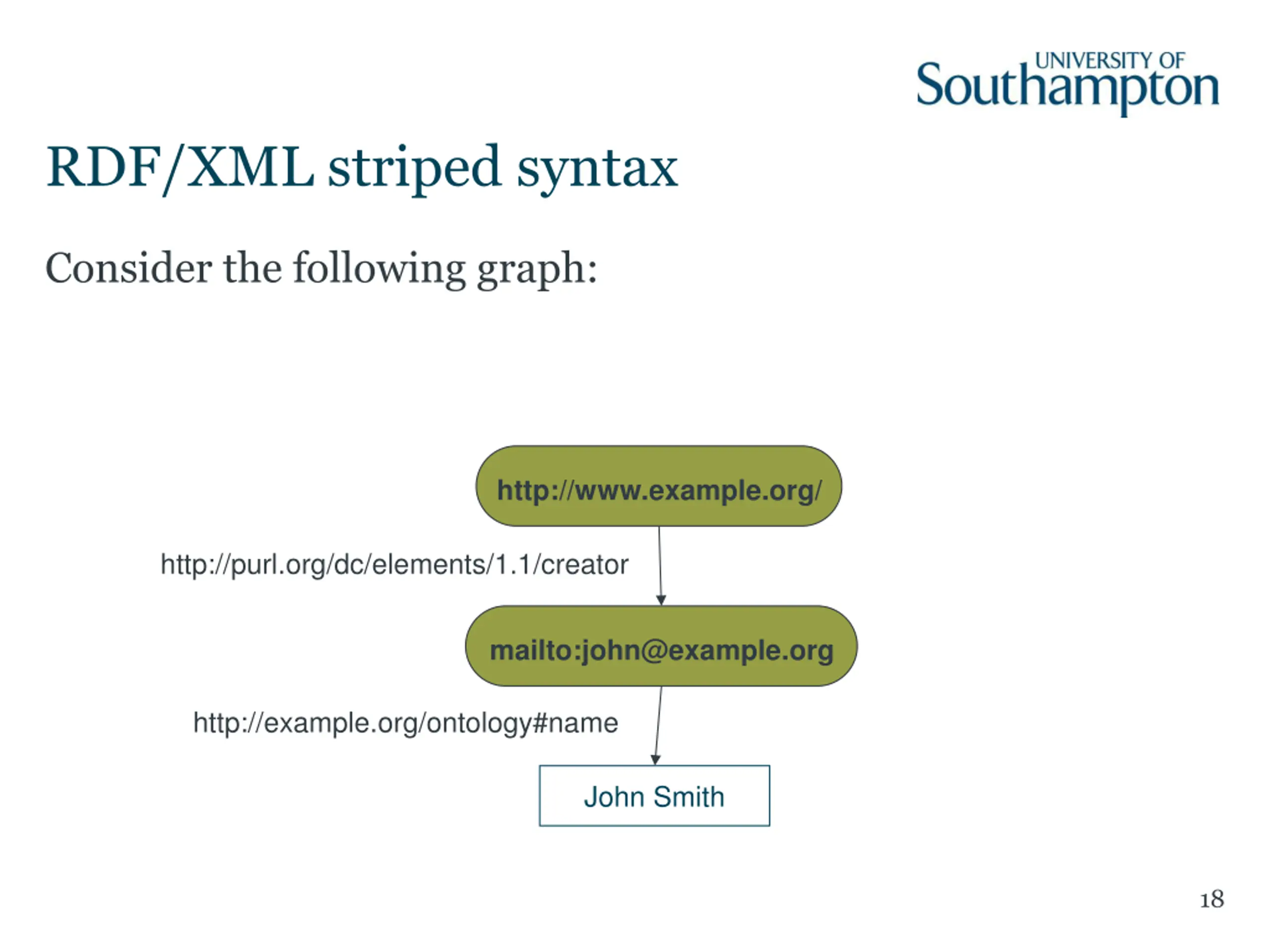 RDF/XML striped syntax Consider the following graph: http://www.example.org/ http://purl.org/dc/elements/1.1/creator mailto:john@example.org http://example.org/ontology#name John Smith 18