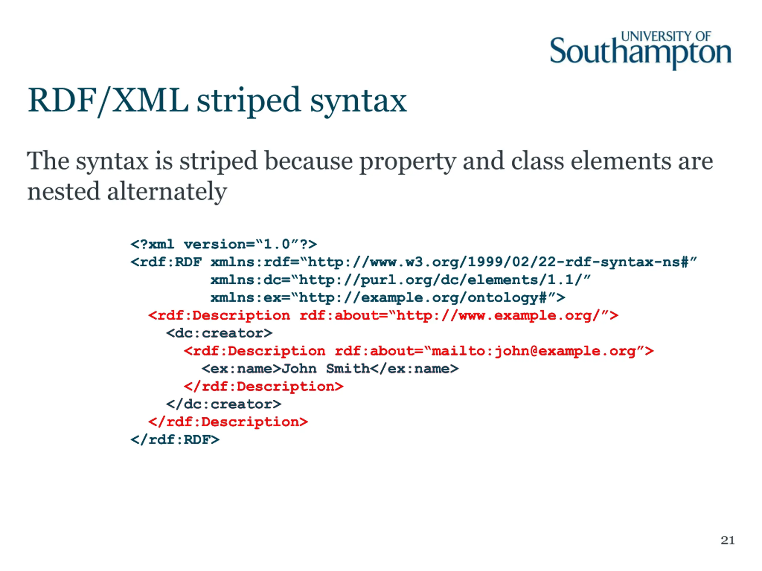 RDF/XML striped syntax The syntax is striped because property and class elements are nested alternately <?xml version= 1.0 ?> <rdf:RDF xmlns:rdf= http://www.w3.org/1999/02/22-rdf-syntax-ns# xmlns:dc= http://purl.org/dc/elements/1.1/ xmlns:ex= http://example.org/ontology# > <rdf:Description rdf:about= http://www.example.org/ > <dc:creator> <rdf:Description rdf:about= mailto:john@example.org > <ex:name>John Smith</ex:name> </rdf:Description> </dc:creator> </rdf:Description> </rdf:RDF> </rdf:RDF> <?xml version= 1.0 ?> <rdf:RDF xmlns:rdf= http://www.w3.org/1999/02/22-rdf-syntax-ns# xmlns:dc= http://purl.org/dc/elements/1.1/ xmlns:ex= http://example.org/ontology# > <rdf:Description rdf:about= http://www.example.org/ > <dc:creator> <rdf:Description rdf:about= mailto:john@example.org > <ex:name>John Smith</ex:name> </rdf:Description> </dc:creator> </rdf:Description> 21