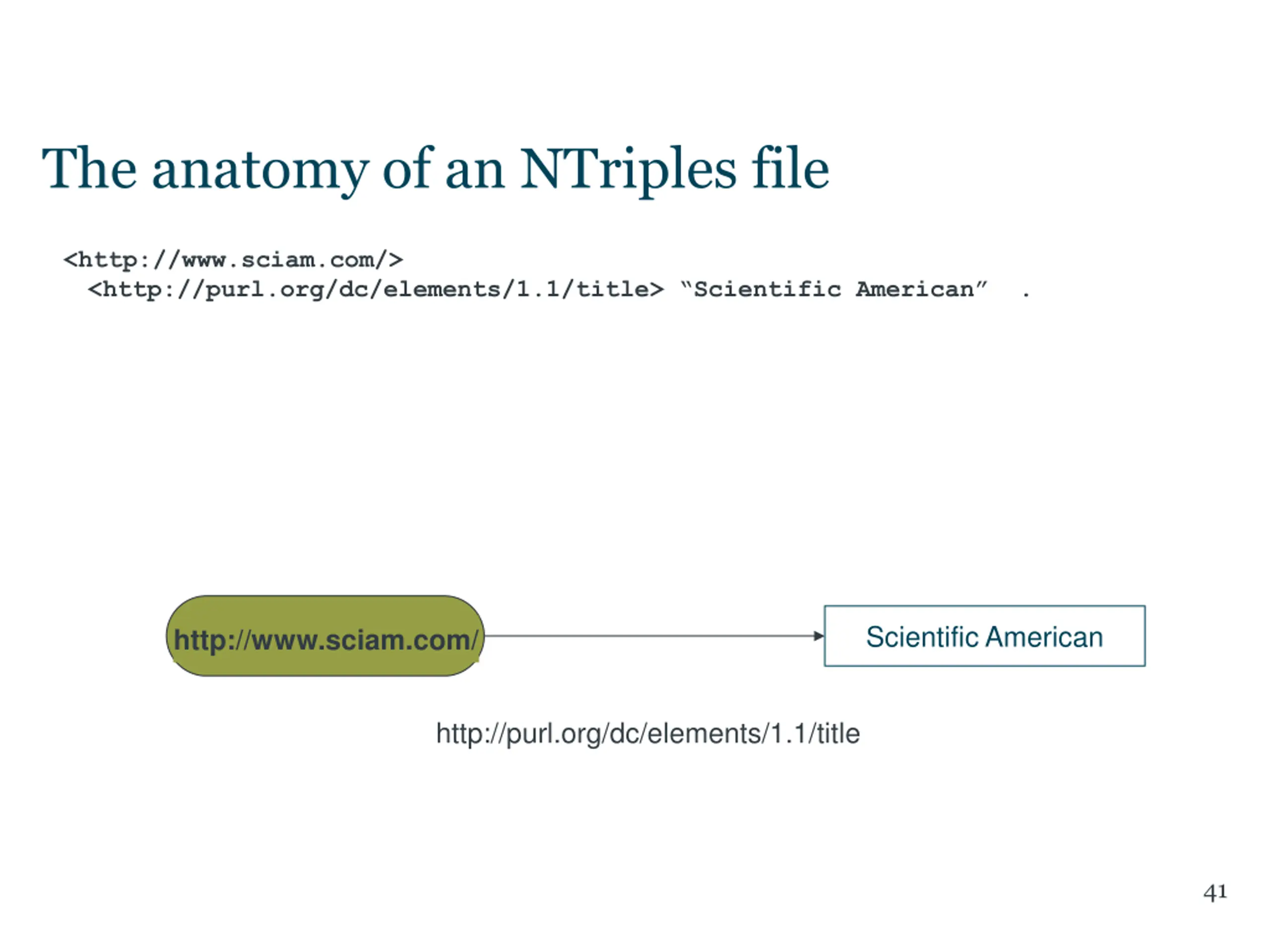 The anatomy of an NTriples file <http://www.sciam.com/> <http://purl.org/dc/elements/1.1/title> Scientific American . Scientific American http://www.sciam.com/ http://purl.org/dc/elements/1.1/title 41