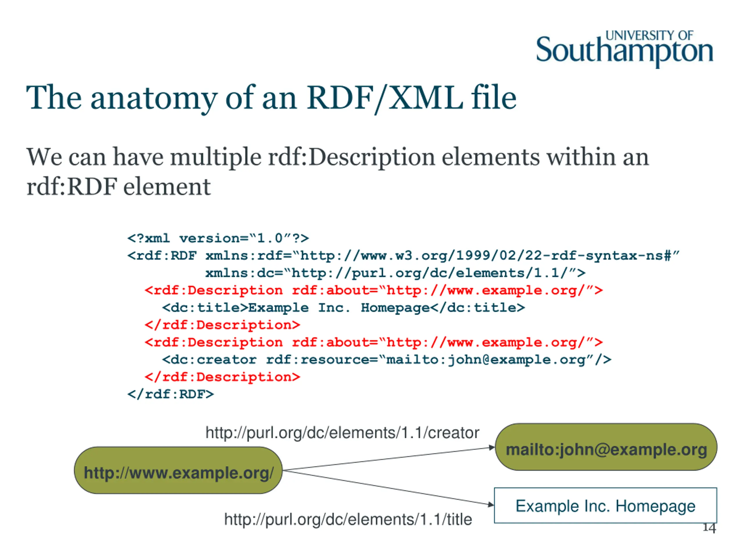The anatomy of an RDF/XML file Resource-valued predicates use the rdf:resource attribute <?xml version= 1.0 ?> <rdf:RDF xmlns:rdf= http://www.w3.org/1999/02/22-rdf-syntax-ns# xmlns:dc= http://purl.org/dc/elements/1.1/ > <rdf:Description rdf:about= http://www.example.org/ > <dc:creator rdf:resource= mailto:john@example.org /> </rdf:Description> </rdf:RDF> http://www.example.org/ mailto:john@example.org http://purl.org/dc/elements/1.1/creator 13