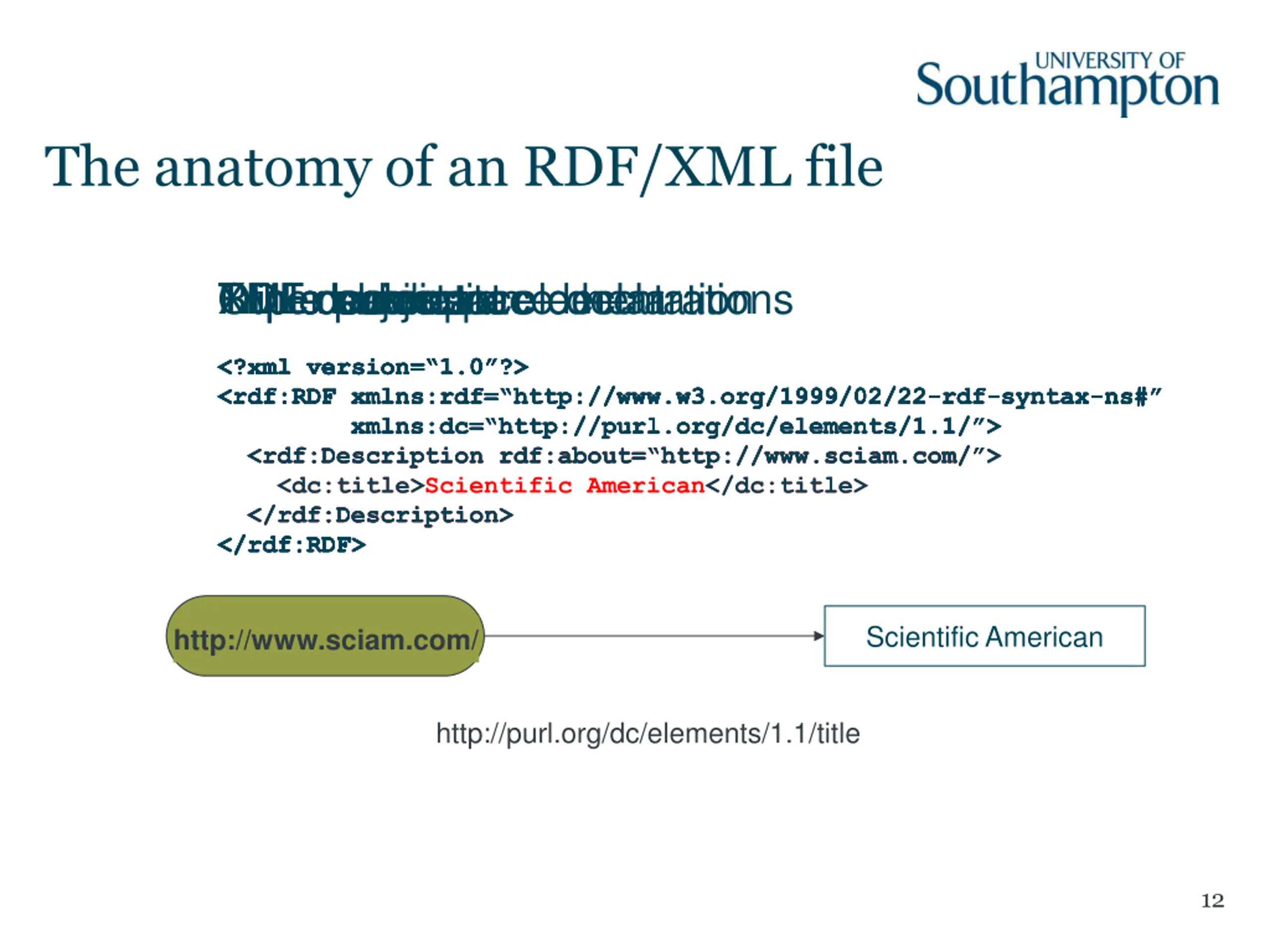 RDF/XML RDF/XML is an XML-based format for expressing a collection of RDF triples (an RDF graph) Can be parsed by an XML parser to give an XML data model (Document Object Model, XML Infoset) Can be parsed by an RDF parser to give an RDF data model (an RDF graph) 11