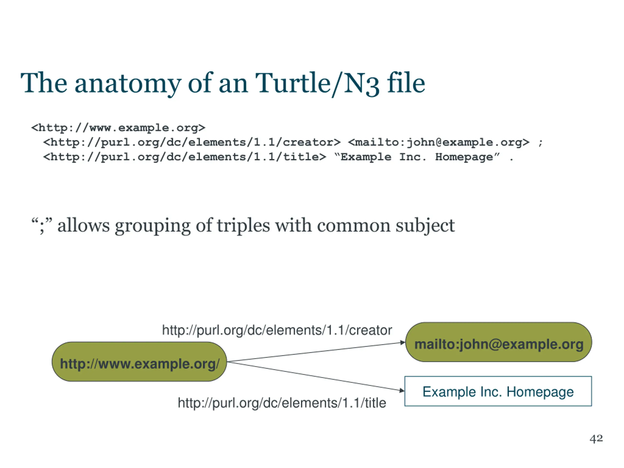 The anatomy of a Turtle/N3 file <http://www.example.org> <http://purl.org/dc/elements/1.1/creator> <mailto:john@example.org> , <mailto:jill@example.org> . , allows grouping of triples with common subject and predicate http://purl.org/dc/elements/1.1/creator mailto:john@example.org http://www.example.org/ Example Inc. Homepage http://purl.org/dc/elements/1.1/title 43