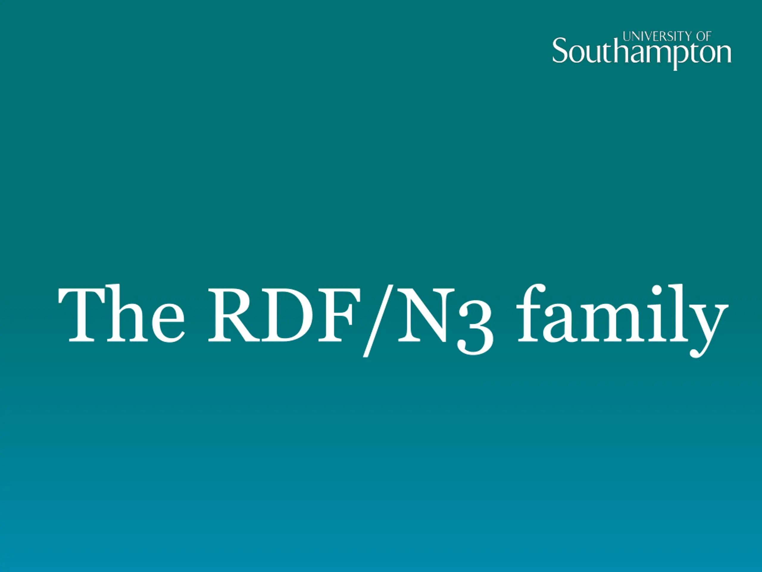 The anatomy of an Turtle/N3 file <http://www.example.org> <http://purl.org/dc/elements/1.1/creator> <mailto:john@example.org> ; <http://purl.org/dc/elements/1.1/title> Example Inc. Homepage . ; allows grouping of triples with common subject http://purl.org/dc/elements/1.1/creator mailto:john@example.org http://www.example.org/ Example Inc. Homepage http://purl.org/dc/elements/1.1/title 42