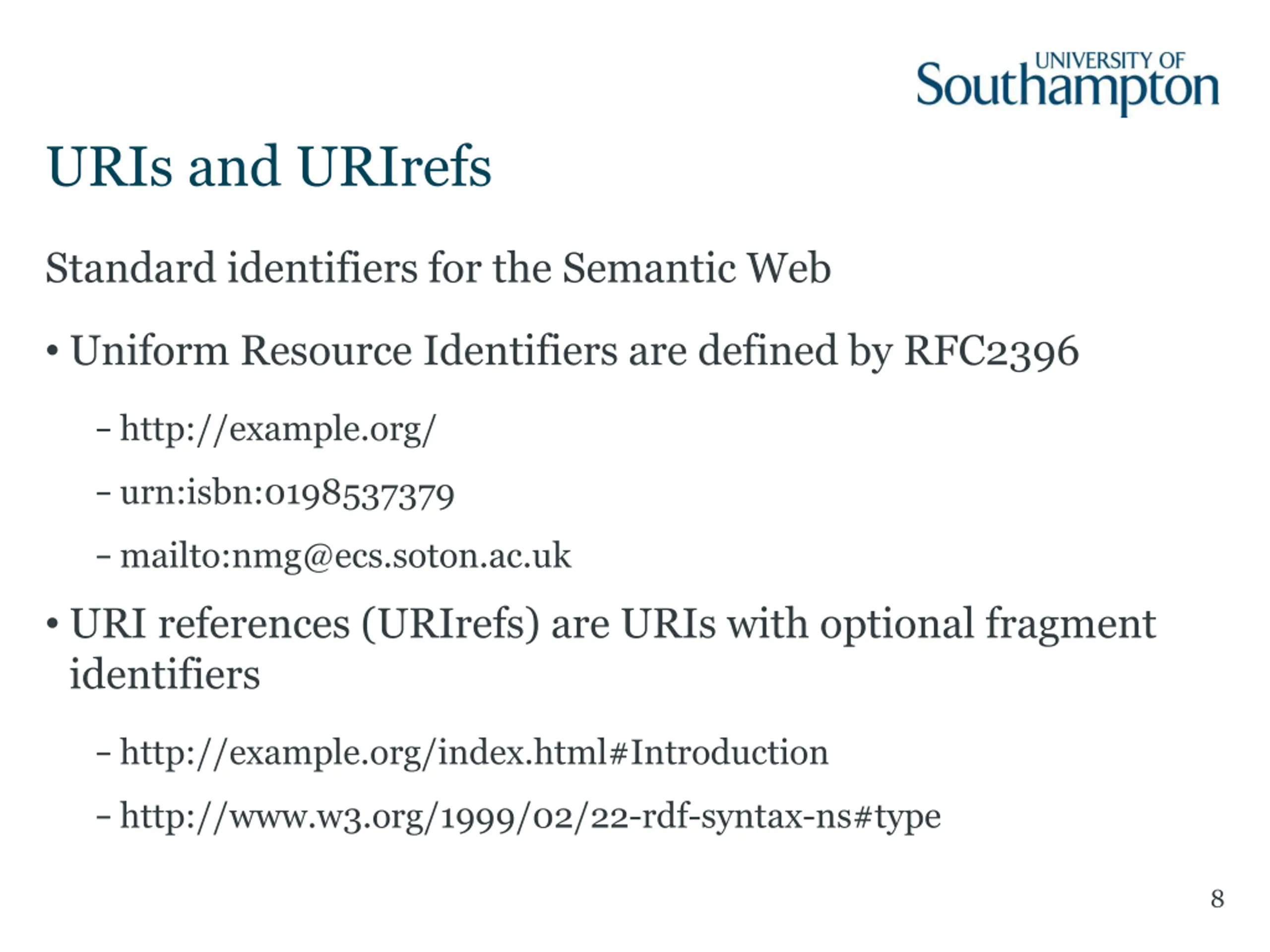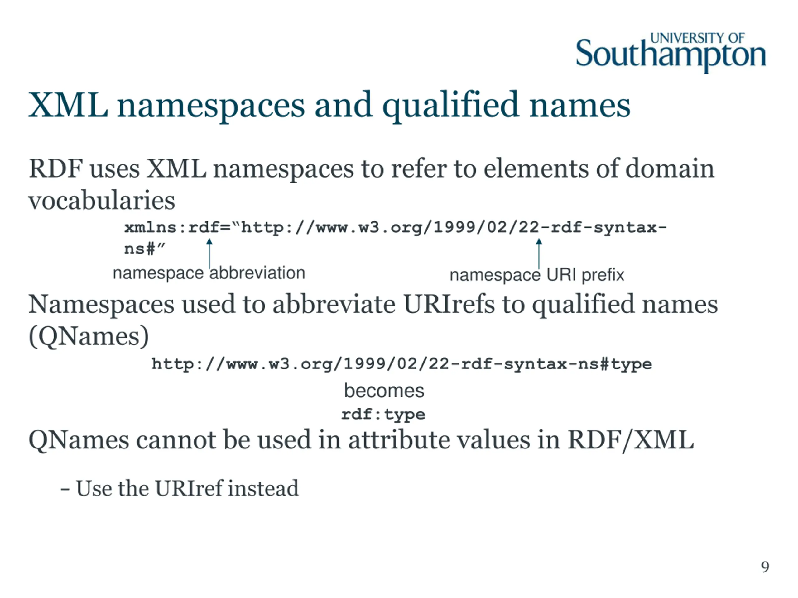 URIs and URIrefs Standard identifiers for the Semantic Web Uniform Resource Identifiers are defined by RFC2396 http://example.org/ urn:isbn:0198537379 mailto:nmg@ecs.soton.ac.uk URI references (URIrefs) are URIs with optional fragment identifiers http://example.org/index.html#Introduction http://www.w3.org/1999/02/22-rdf-syntax-ns#type 8
