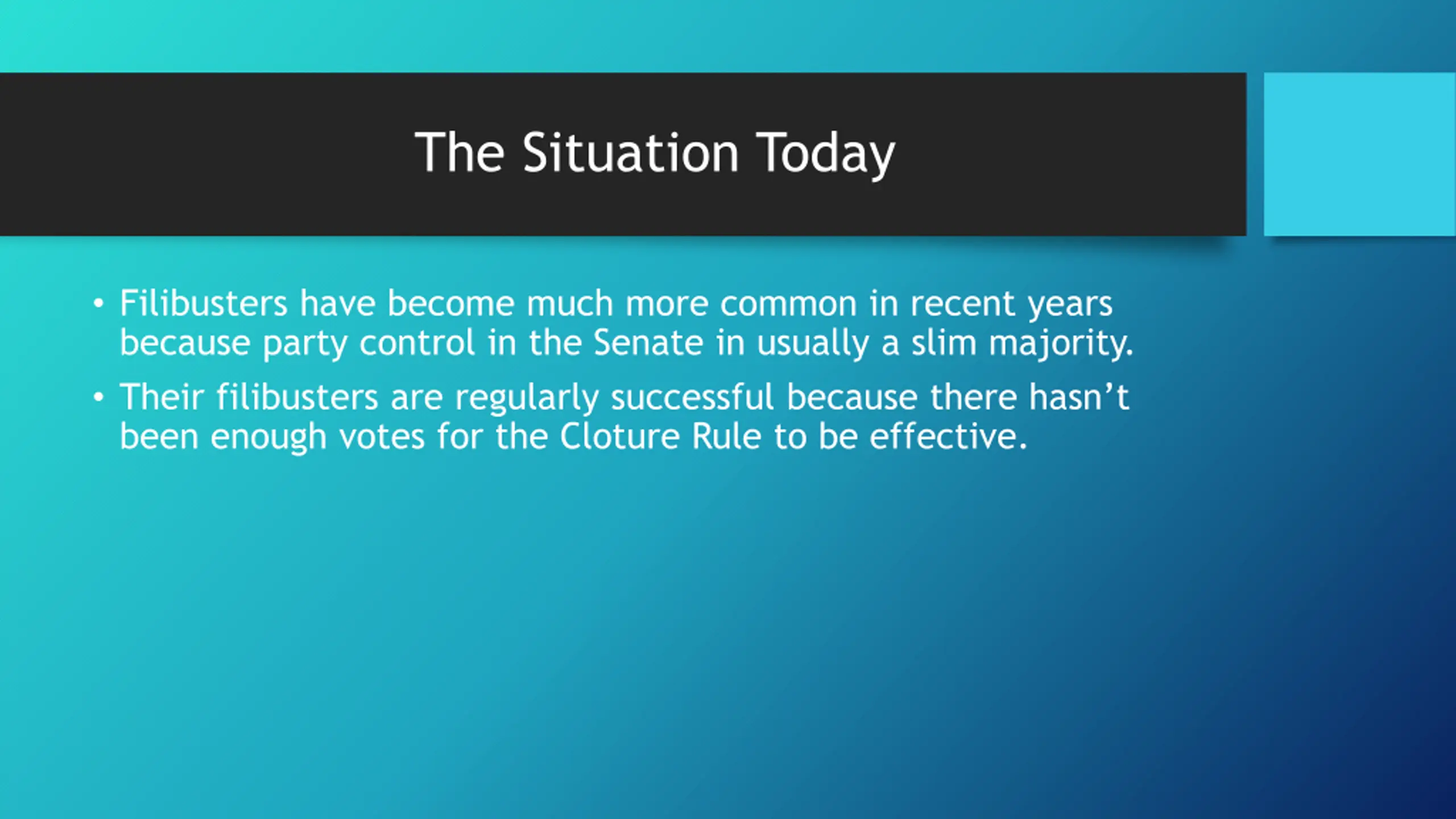 The Situation Today Filibusters have become much more common in recent years because party control in the Senate in usually a slim majority. Their filibusters are regularly successful because there hasn t been enough votes for the Cloture Rule to be effective.