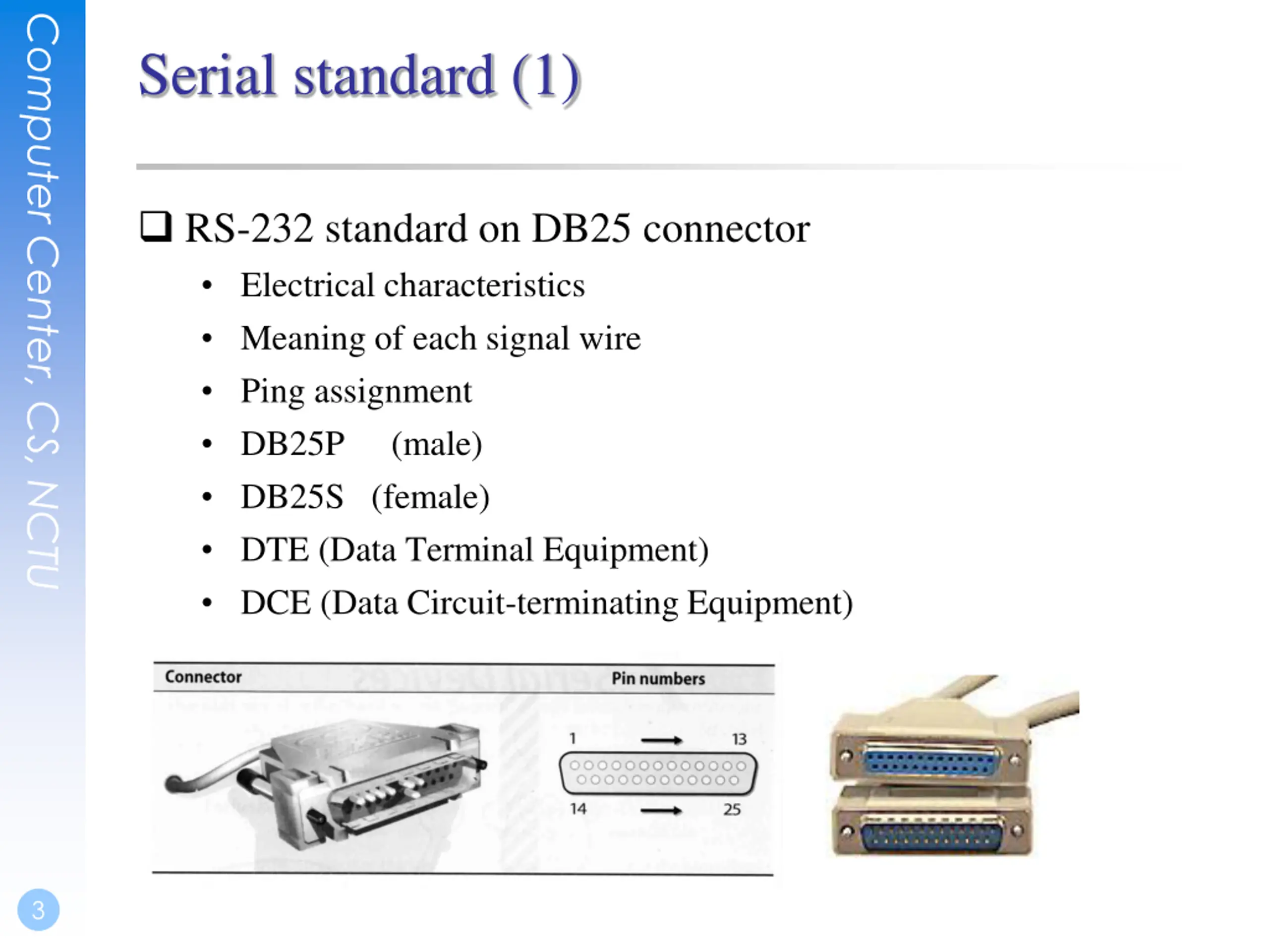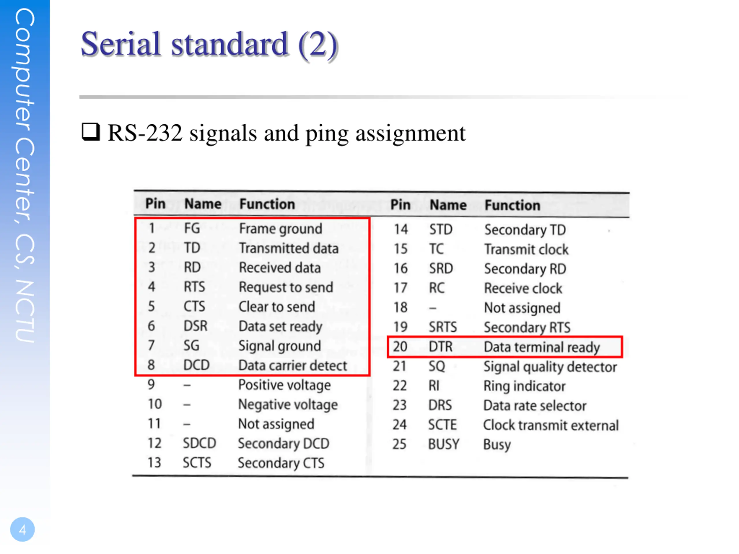 Computer Center, CS, NCTU Serial standard (1) RS-232 standard on DB25 connector Electrical characteristics Meaning of each signal wire Ping assignment DB25P (male) DB25S (female) DTE (Data Terminal Equipment) DCE (Data Circuit-terminating Equipment) 3