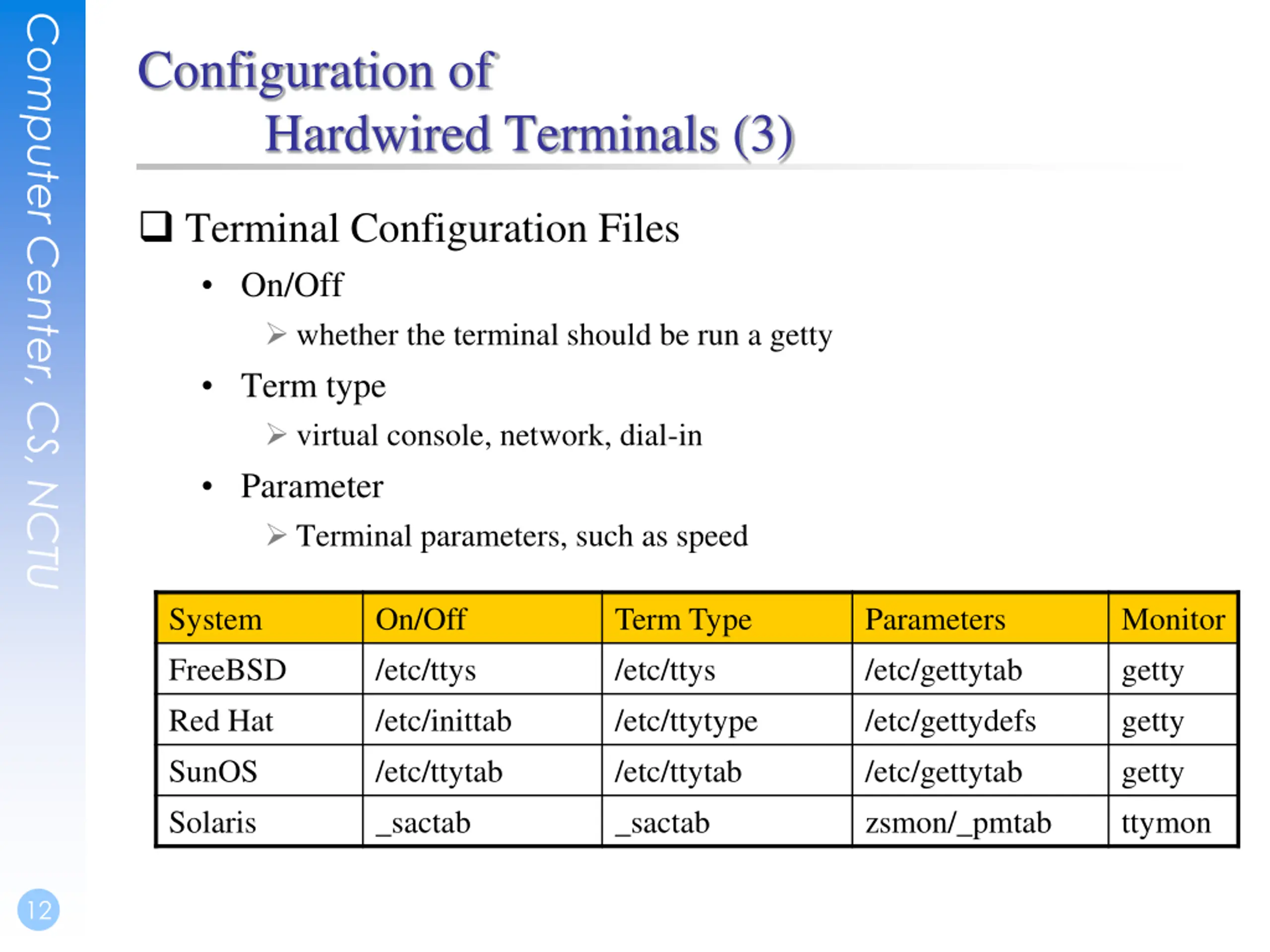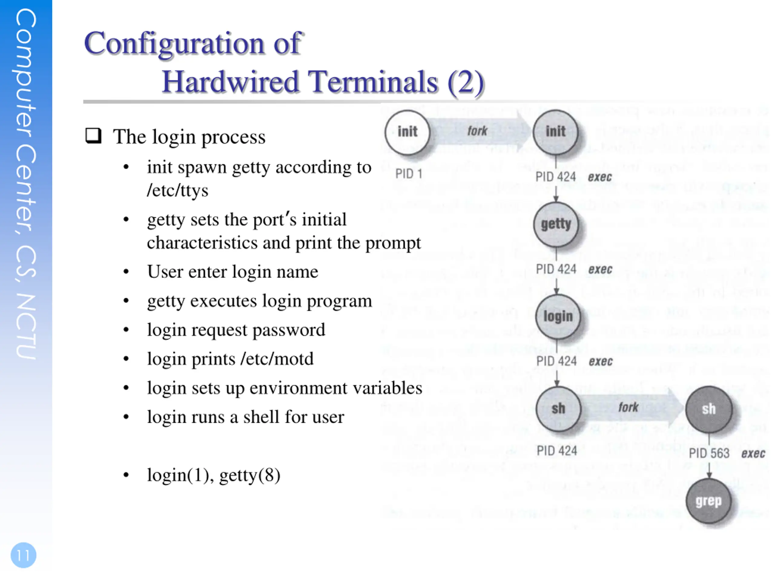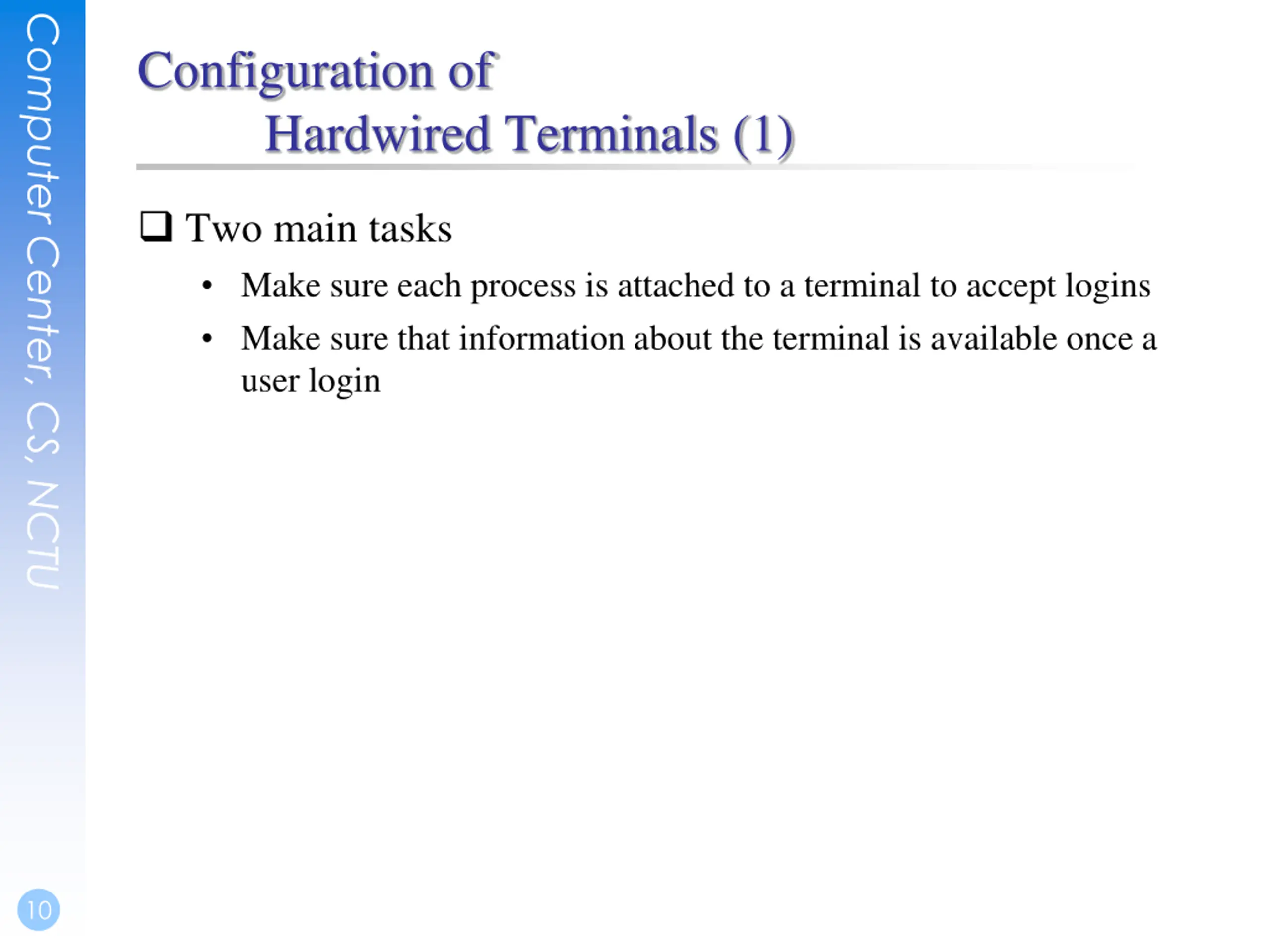 Computer Center, CS, NCTU Configuration of Hardwired Terminals (1) Two main tasks Make sure each process is attached to a terminal to accept logins Make sure that information about the terminal is available once a user login 10