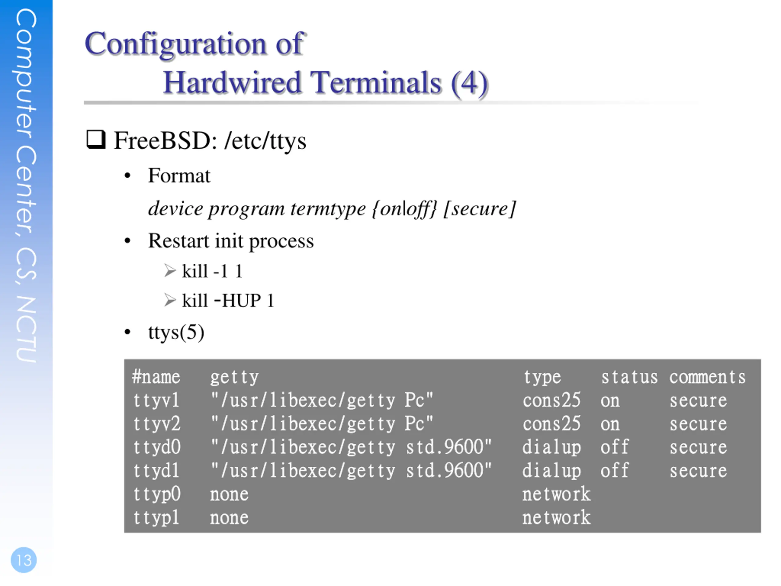 Computer Center, CS, NCTU Configuration of Hardwired Terminals (3) Terminal Configuration Files On/Off whether the terminal should be run a getty Term type virtual console, network, dial-in Parameter Terminal parameters, such as speed System FreeBSD Red Hat SunOS Solaris On/Off /etc/ttys /etc/inittab /etc/ttytab _sactab Term Type /etc/ttys /etc/ttytype /etc/ttytab _sactab Parameters /etc/gettytab /etc/gettydefs /etc/gettytab zsmon/_pmtab Monitor getty getty getty ttymon 12