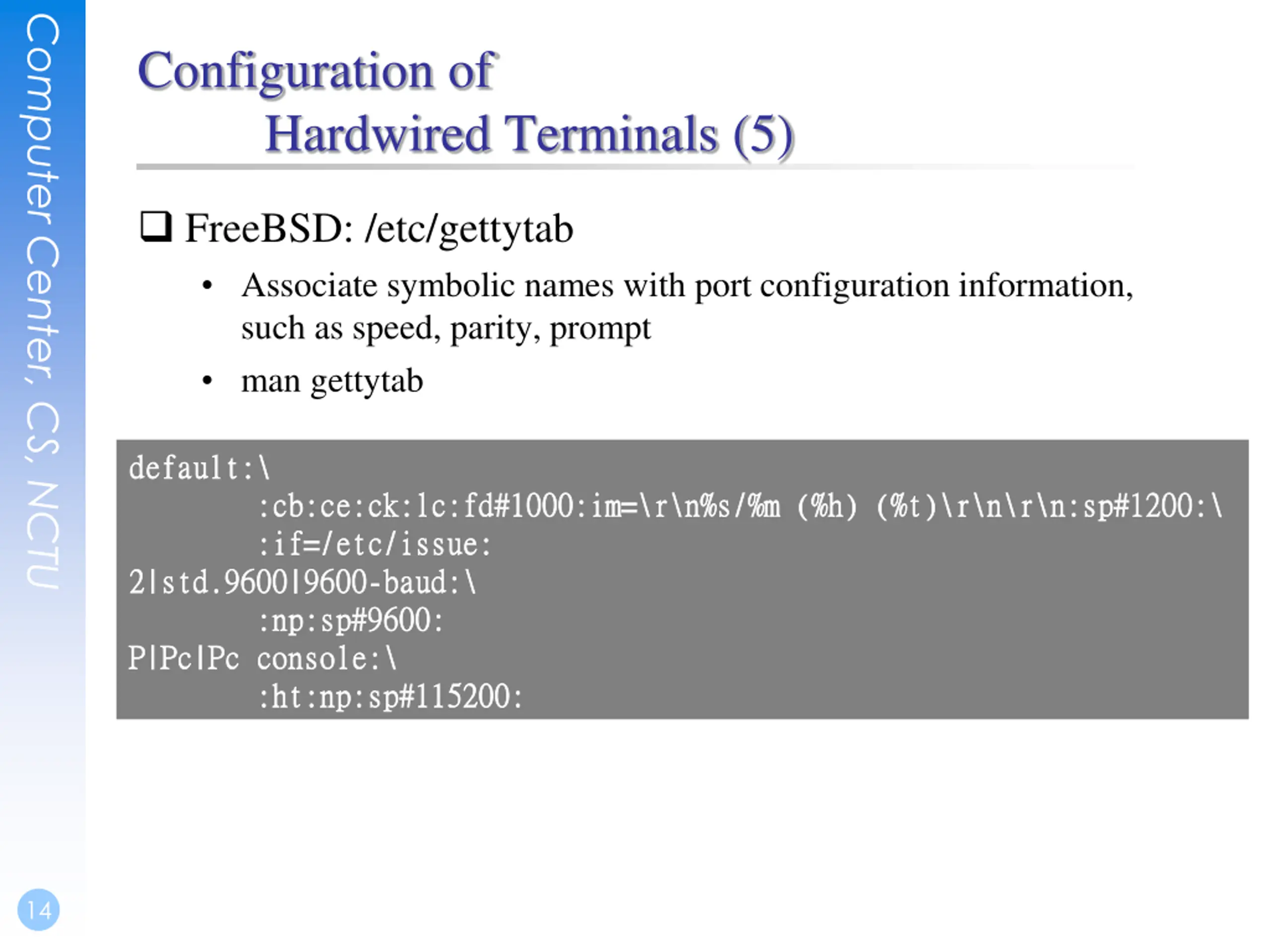 Computer Center, CS, NCTU Configuration of Hardwired Terminals (4) FreeBSD: /etc/ttys Format device program termtype {on|off} [secure] Restart init process kill -1 1 kill -HUP 1 ttys(5) #name getty type status comments #name getty type status comments ttyv1 "/usr/libexec/getty Pc" cons25 on secure ttyv1 "/usr/libexec/getty Pc" cons25 on secure ttyv2 "/usr/libexec/getty Pc" cons25 on secure ttyv2 "/usr/libexec/getty Pc" cons25 on secure ttyd0 "/usr/libexec/getty std.9600" dialup off secure ttyd0 "/usr/libexec/getty std.9600" dialup off secure ttyd1 "/usr/libexec/getty std.9600" dialup off secure ttyd1 "/usr/libexec/getty std.9600" dialup off secure ttyp0 none network ttyp0 none network ttyp1 none network ttyp1 none network 13