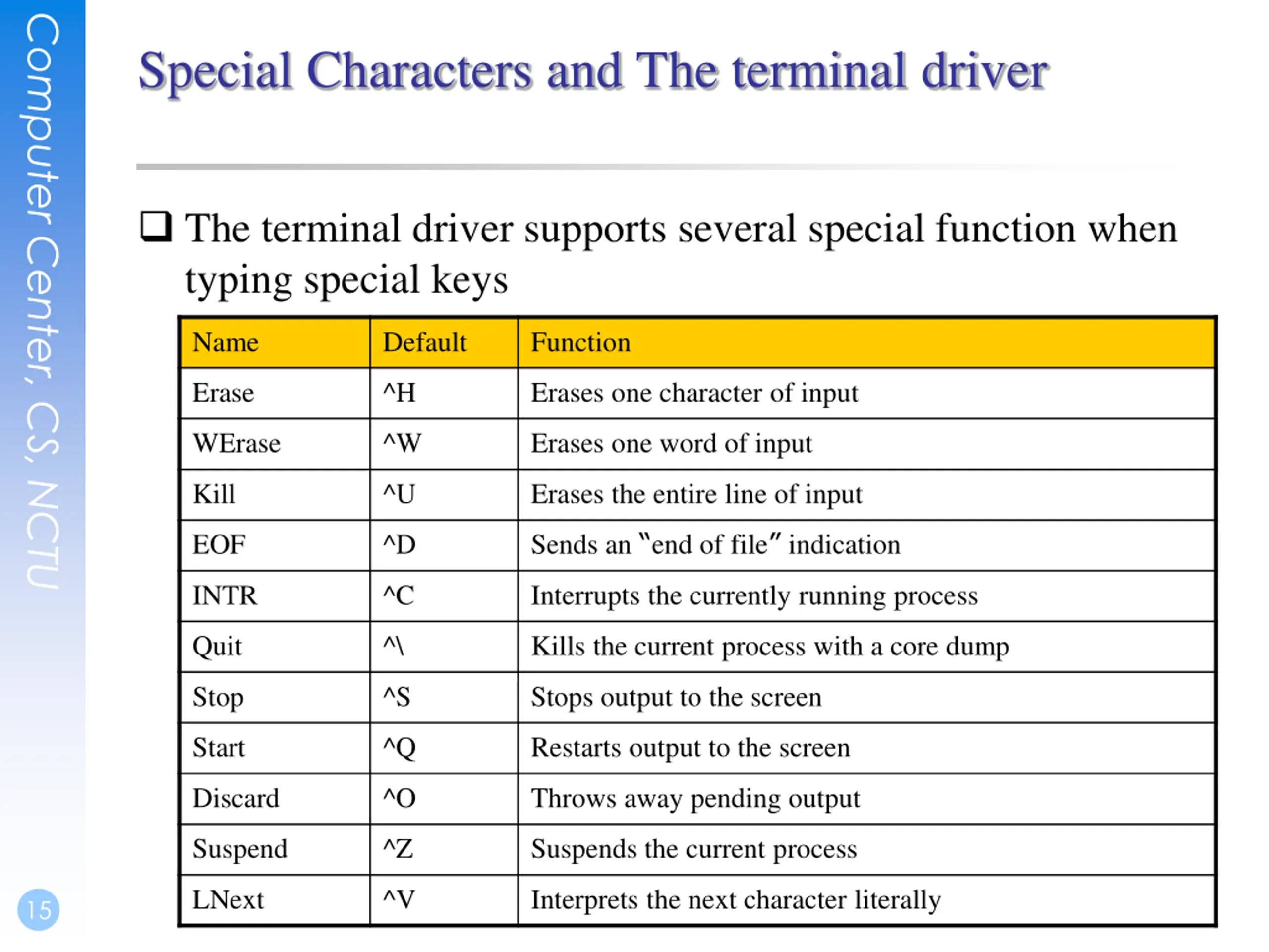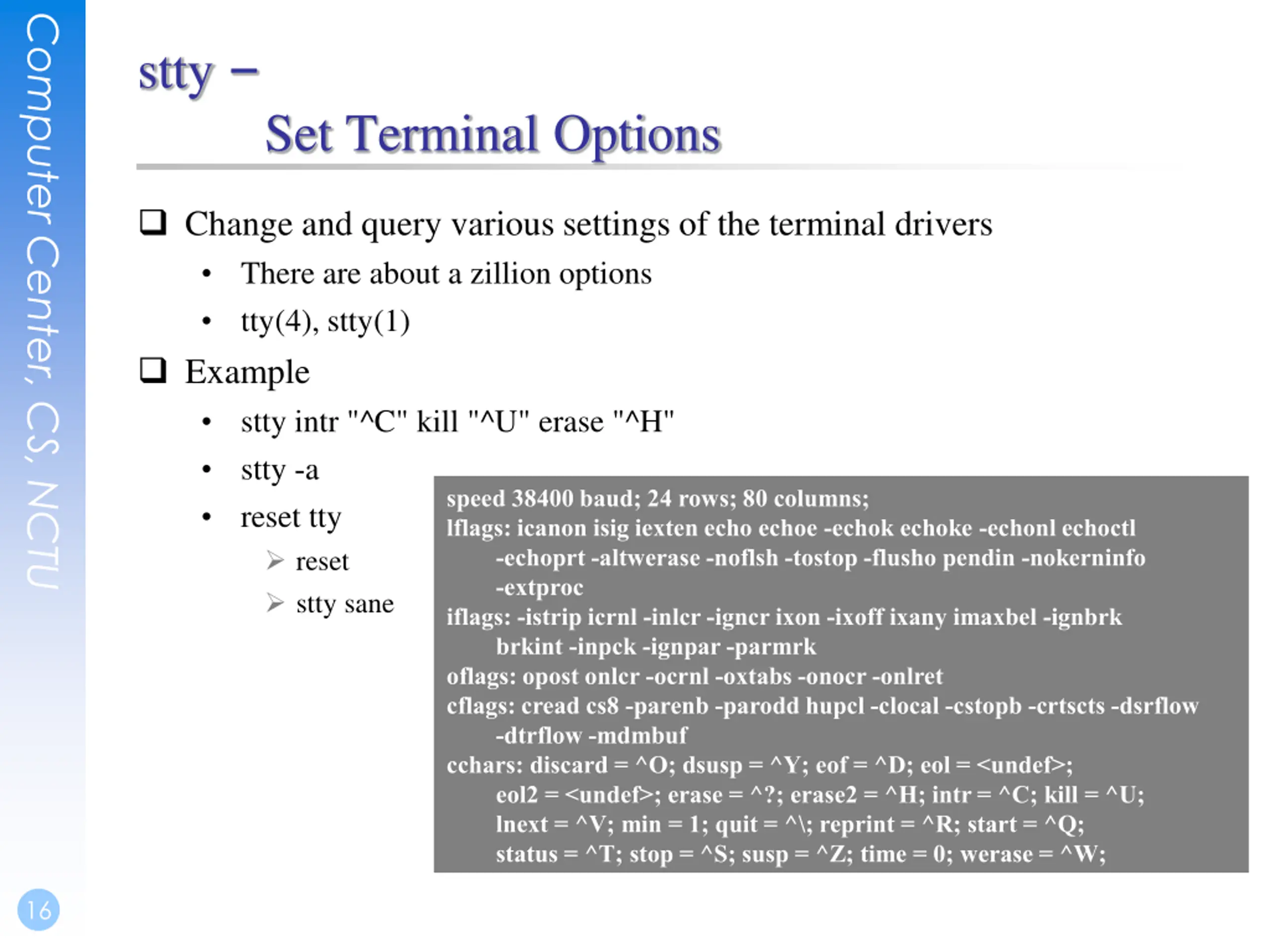 Computer Center, CS, NCTU Special Characters and The terminal driver The terminal driver supports several special function when typing special keys Name Default Function Erase ^H Erases one character of input WErase ^W Erases one word of input Kill ^U Erases the entire line of input Sends an end of file indication EOF ^D INTR ^C Interrupts the currently running process Quit ^\ Kills the current process with a core dump Stop ^S Stops output to the screen Start ^Q Restarts output to the screen Discard ^O Throws away pending output Suspend ^Z Suspends the current process LNext ^V Interprets the next character literally 15