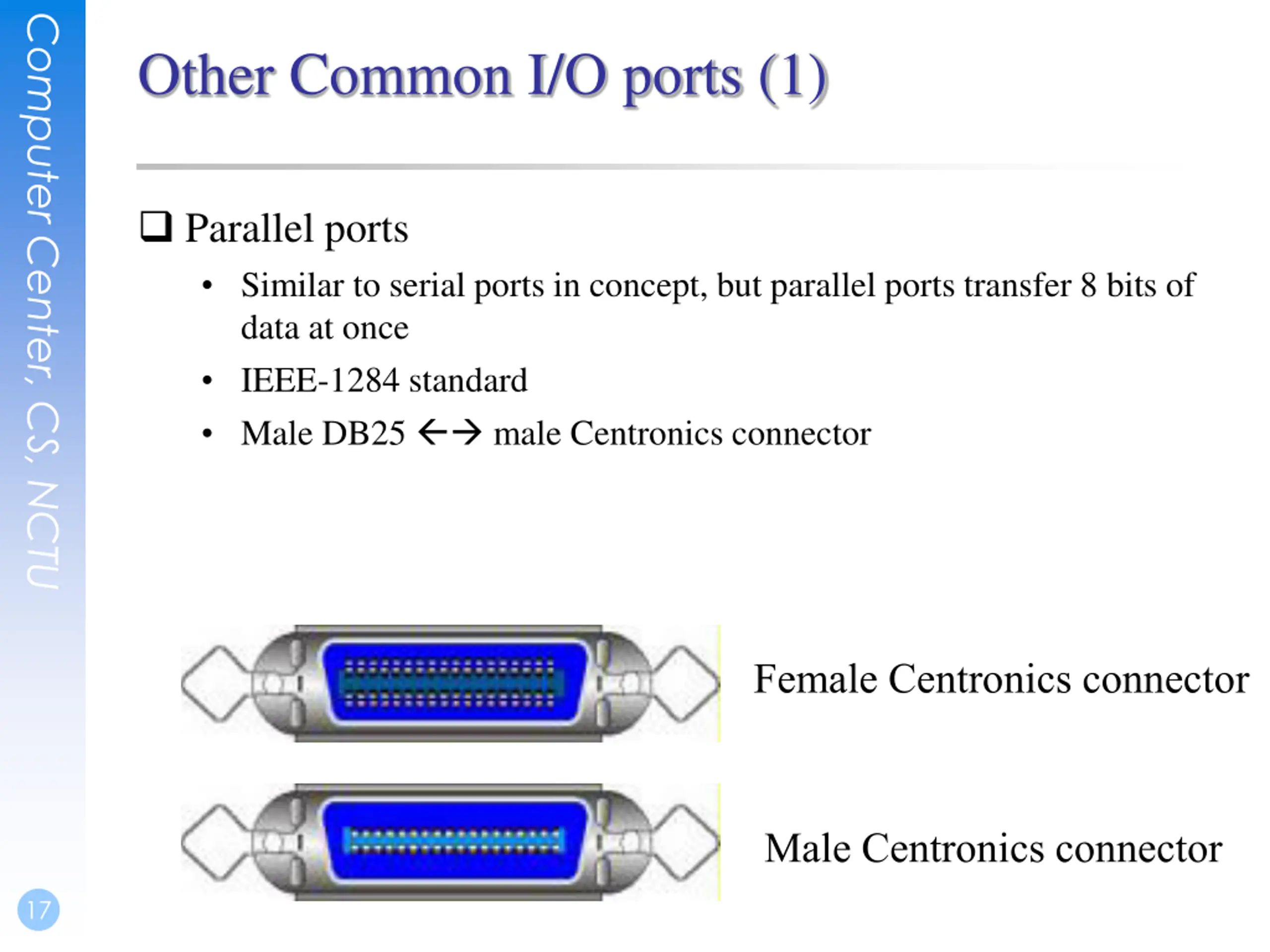 Computer Center, CS, NCTU Other Common I/O ports (1) Parallel ports Similar to serial ports in concept, but parallel ports transfer 8 bits of data at once IEEE-1284 standard Male DB25 male Centronics connector Female Centronics connector Male Centronics connector 17
