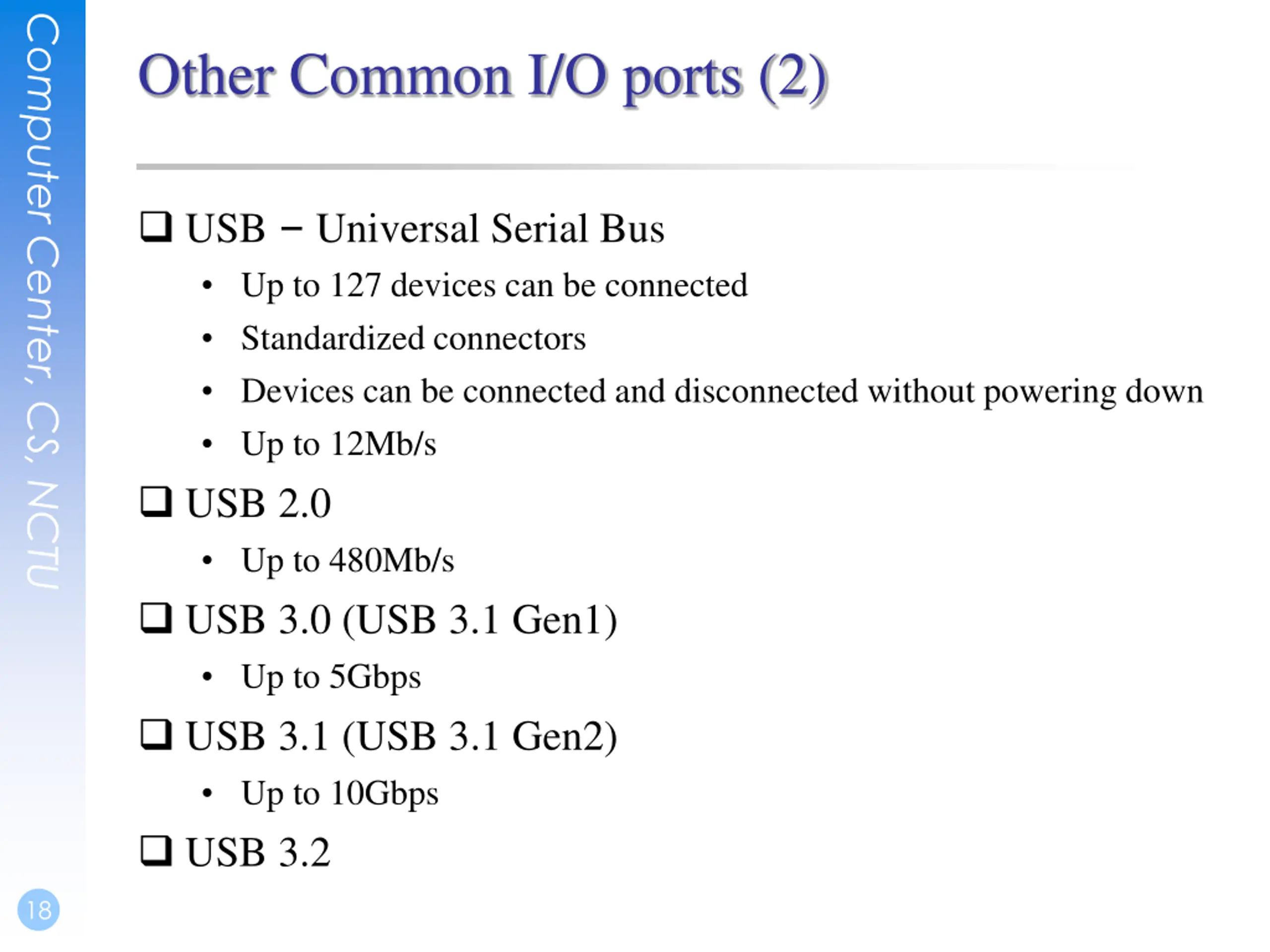 Computer Center, CS, NCTU Other Common I/O ports (2) USB Universal Serial Bus Up to 127 devices can be connected Standardized connectors Devices can be connected and disconnected without powering down Up to 12Mb/s USB 2.0 Up to 480Mb/s USB 3.0 (USB 3.1 Gen1) Up to 5Gbps USB 3.1 (USB 3.1 Gen2) Up to 10Gbps USB 3.2 18