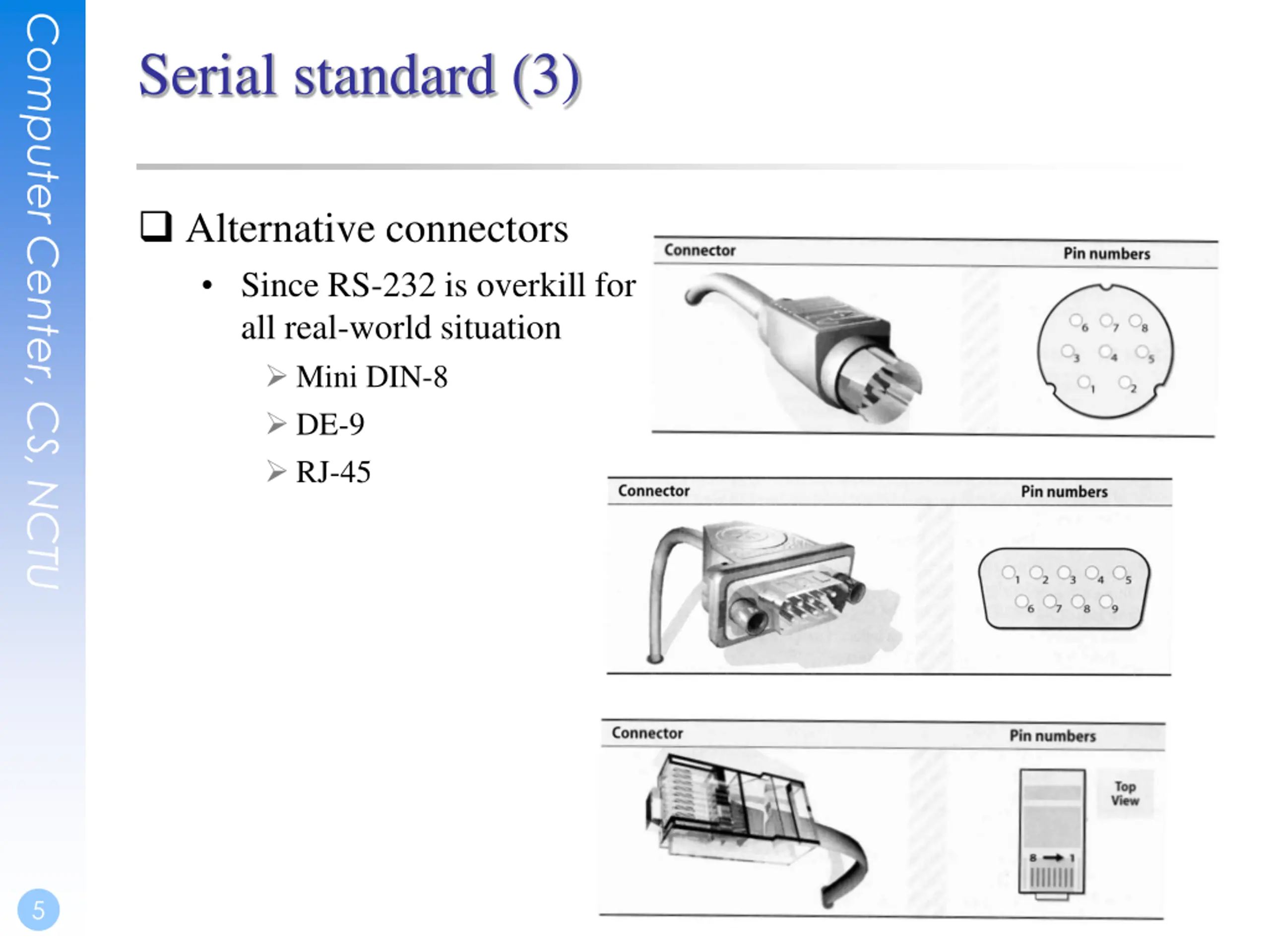 Computer Center, CS, NCTU Serial standard (3) Alternative connectors Since RS-232 is overkill for all real-world situation Mini DIN-8 DE-9 RJ-45 5