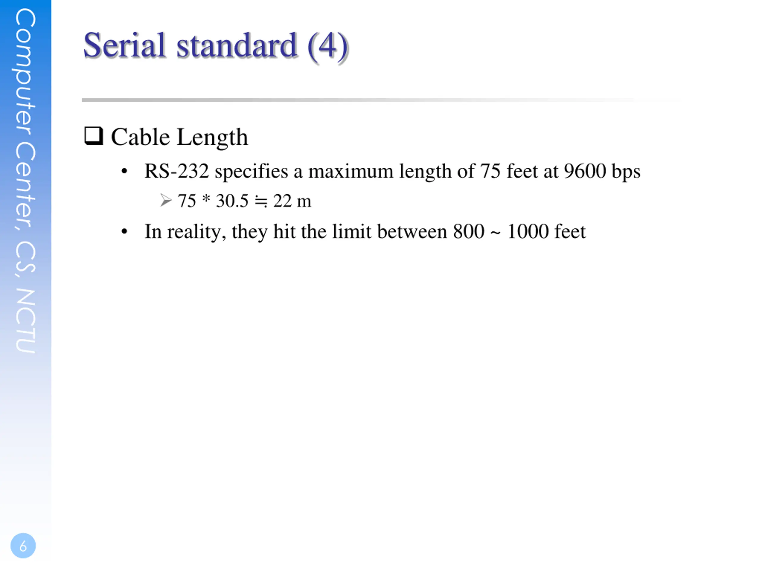 Computer Center, CS, NCTU Serial standard (4) Cable Length RS-232 specifies a maximum length of 75 feet at 9600 bps 75 * 30.5 22 m In reality, they hit the limit between 800 ~ 1000 feet 6