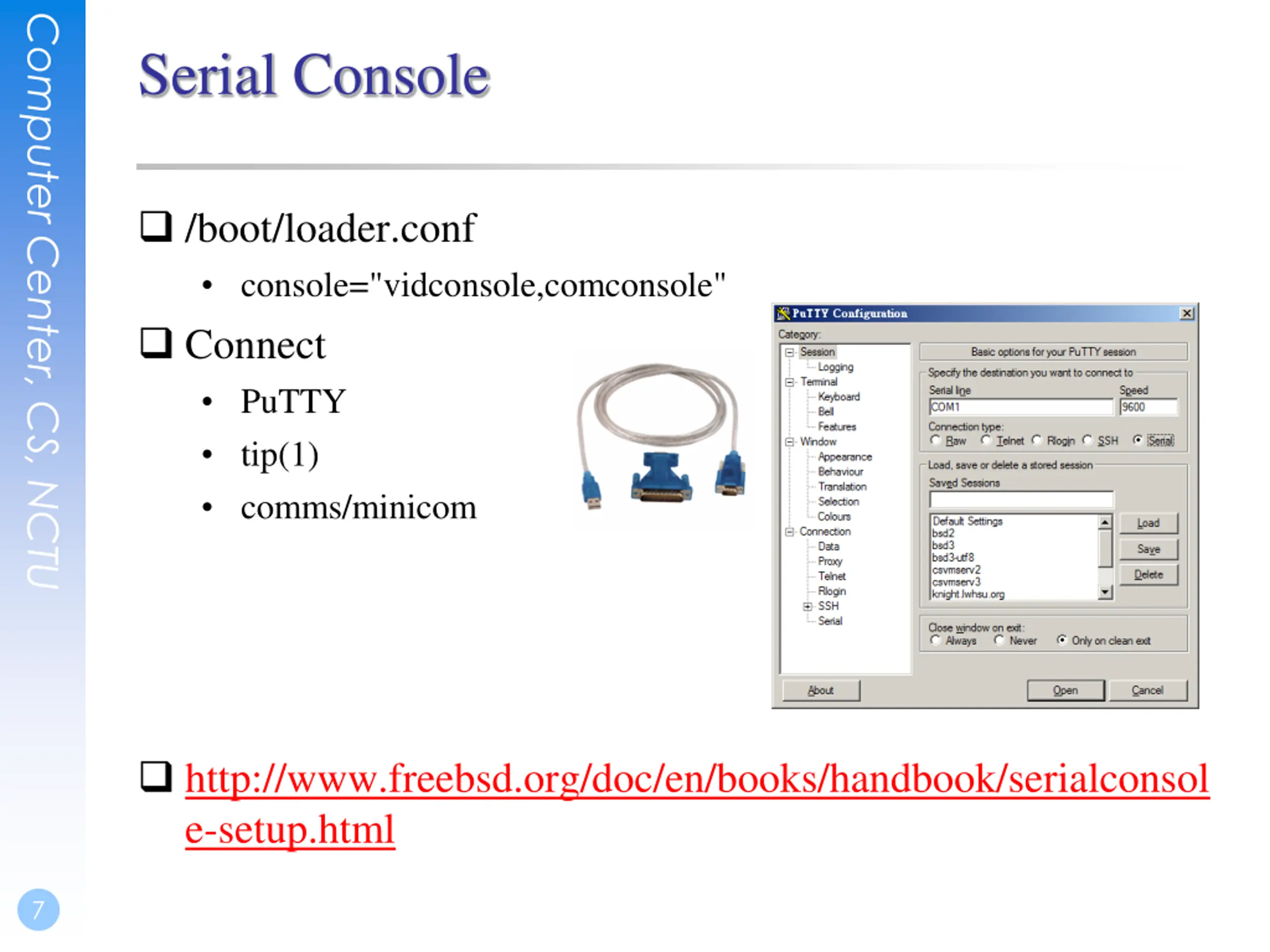 Computer Center, CS, NCTU Serial Console /boot/loader.conf console="vidconsole,comconsole" Connect PuTTY tip(1) comms/minicom http://www.freebsd.org/doc/en/books/handbook/serialconsol e-setup.html 7