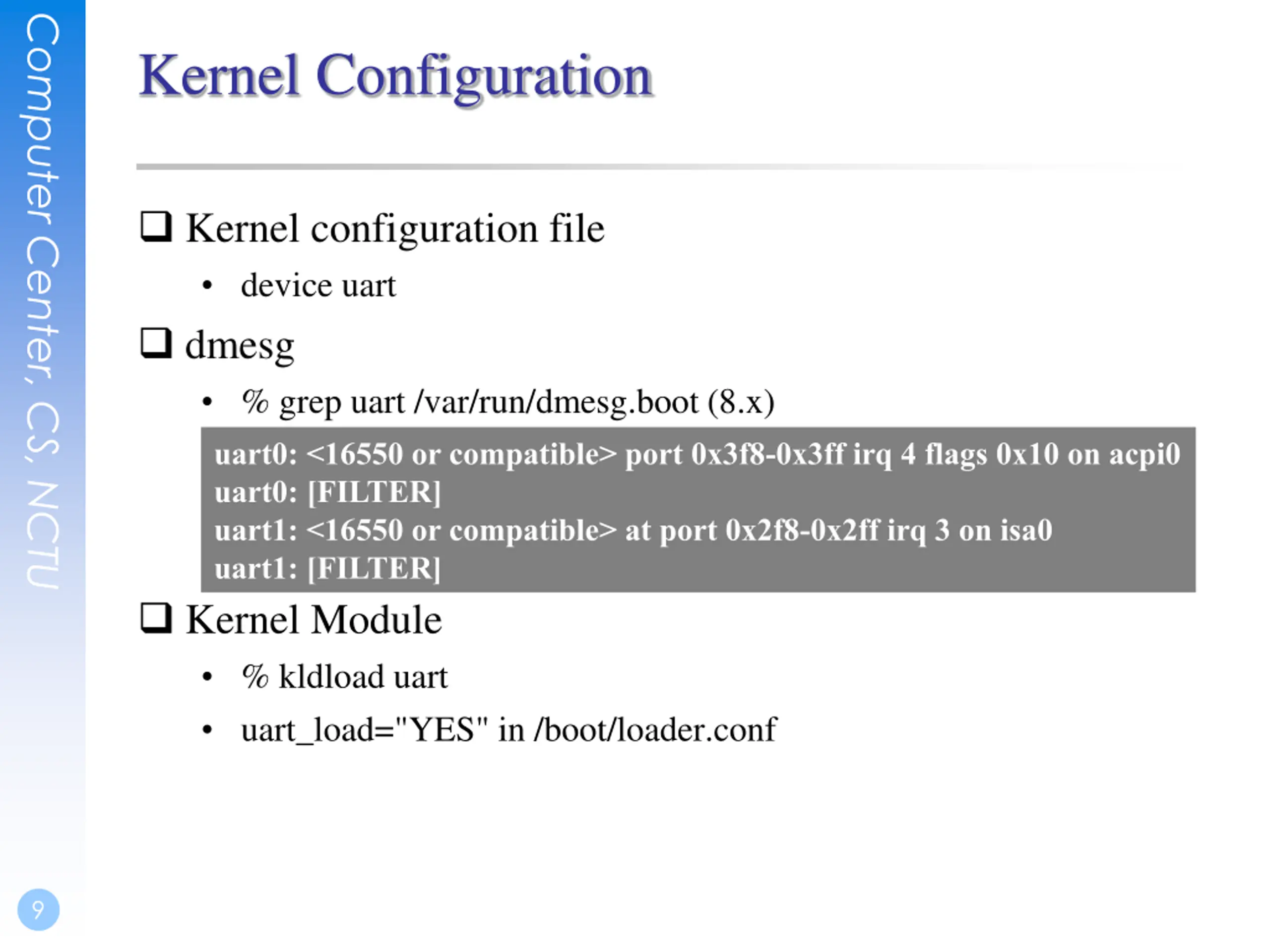 Computer Center, CS, NCTU Kernel Configuration Kernel configuration file device uart dmesg % grep uart /var/run/dmesg.boot (8.x) uart0: <16550 or compatible> port 0x3f8-0x3ff irq 4 flags 0x10 on acpi0 uart0: [FILTER] uart1: <16550 or compatible> at port 0x2f8-0x2ff irq 3 on isa0 uart1: [FILTER] Kernel Module % kldload uart uart_load="YES" in /boot/loader.conf 9