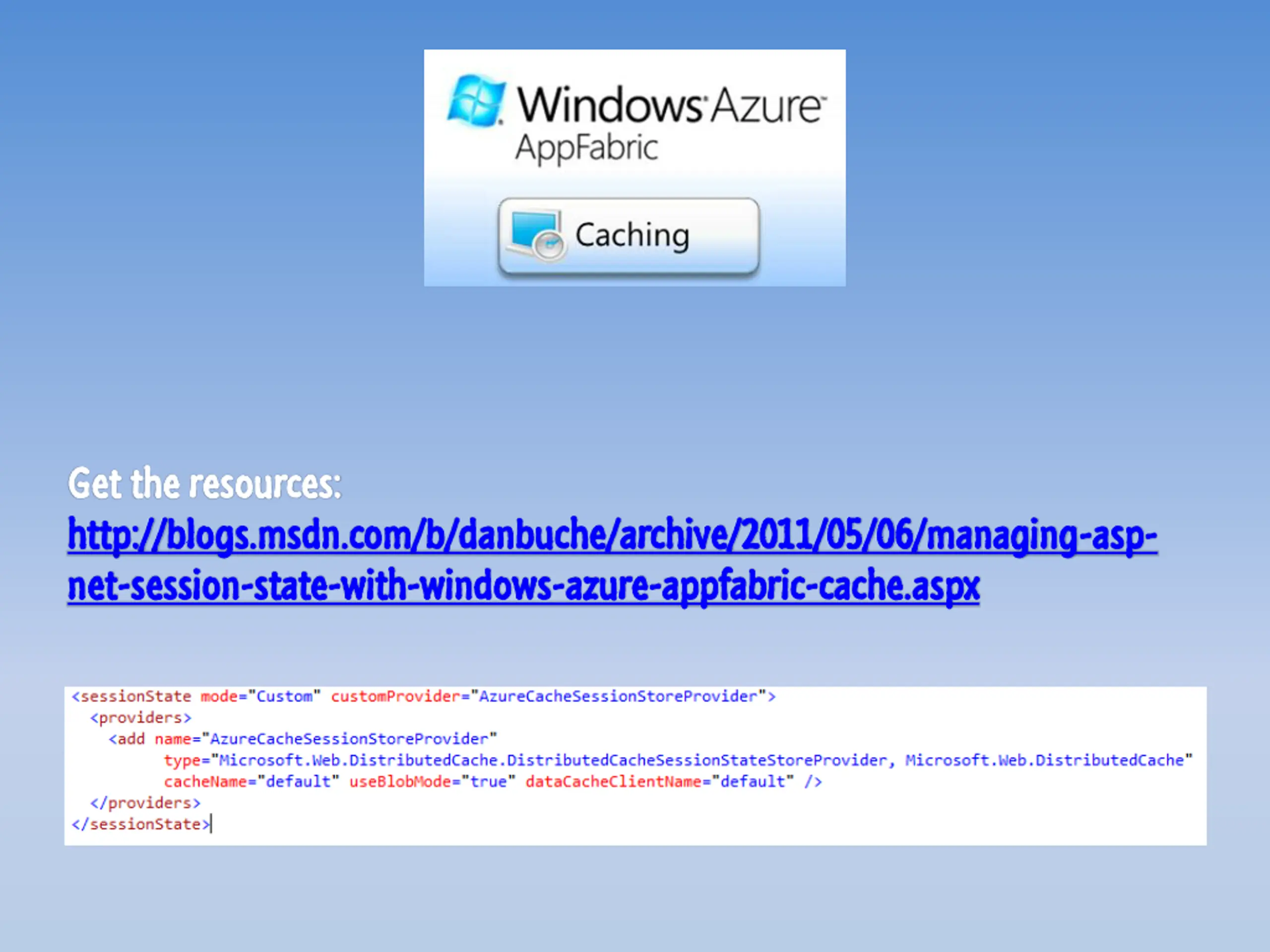 Get Get the resources: the resources: http:// http://blogs.msdn.com/b/danbuche/archive/2011/05/06/managing blogs.msdn.com/b/danbuche/archive/2011/05/06/managing- -asp net net- -session session- -state state- -with with- -windows windows- -azure azure- -appfabric asp- - appfabric- -cache.aspx cache.aspx