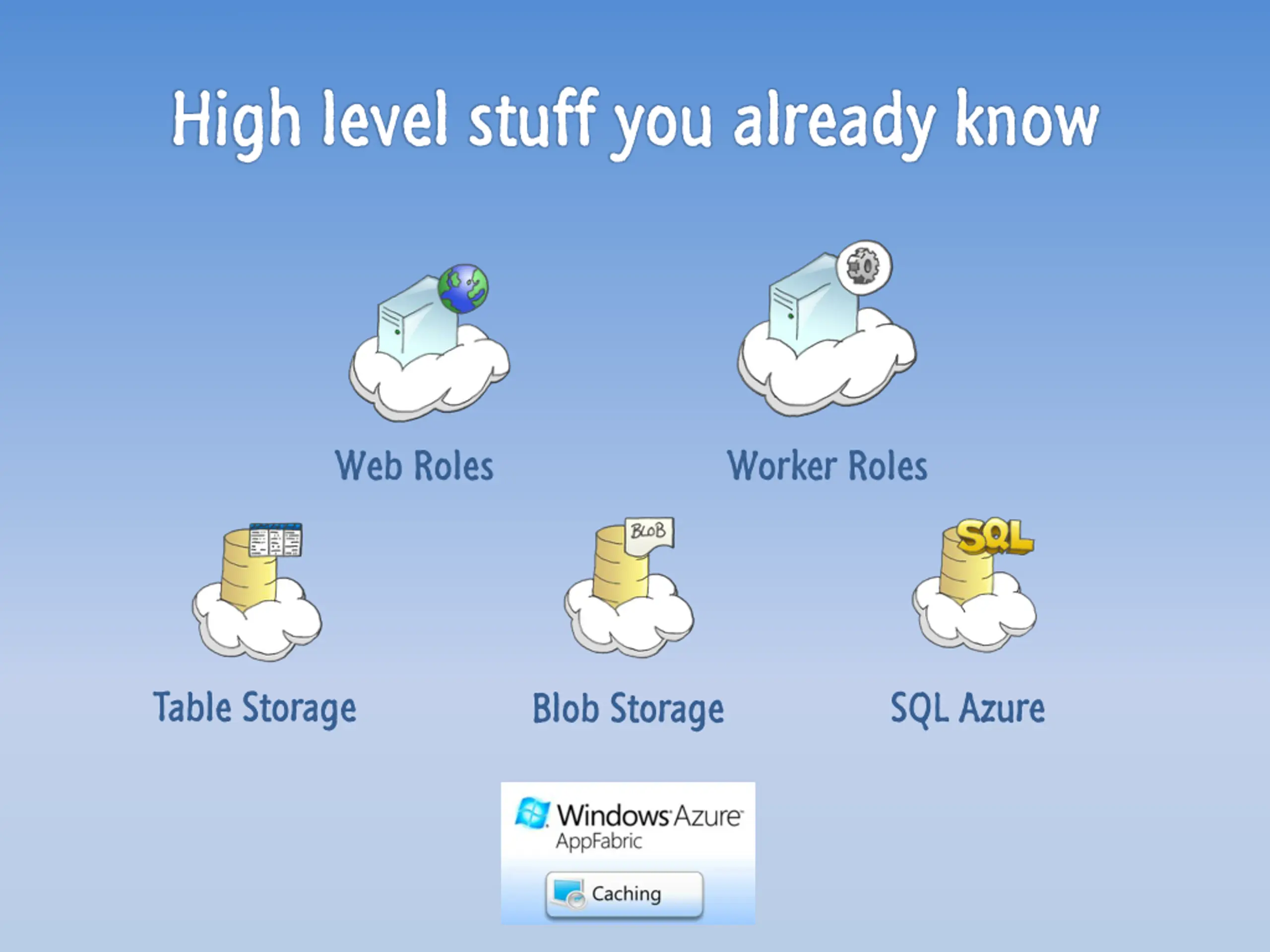 High level stuff you already know Web Roles Worker Roles Table Storage SQL Azure Blob Storage