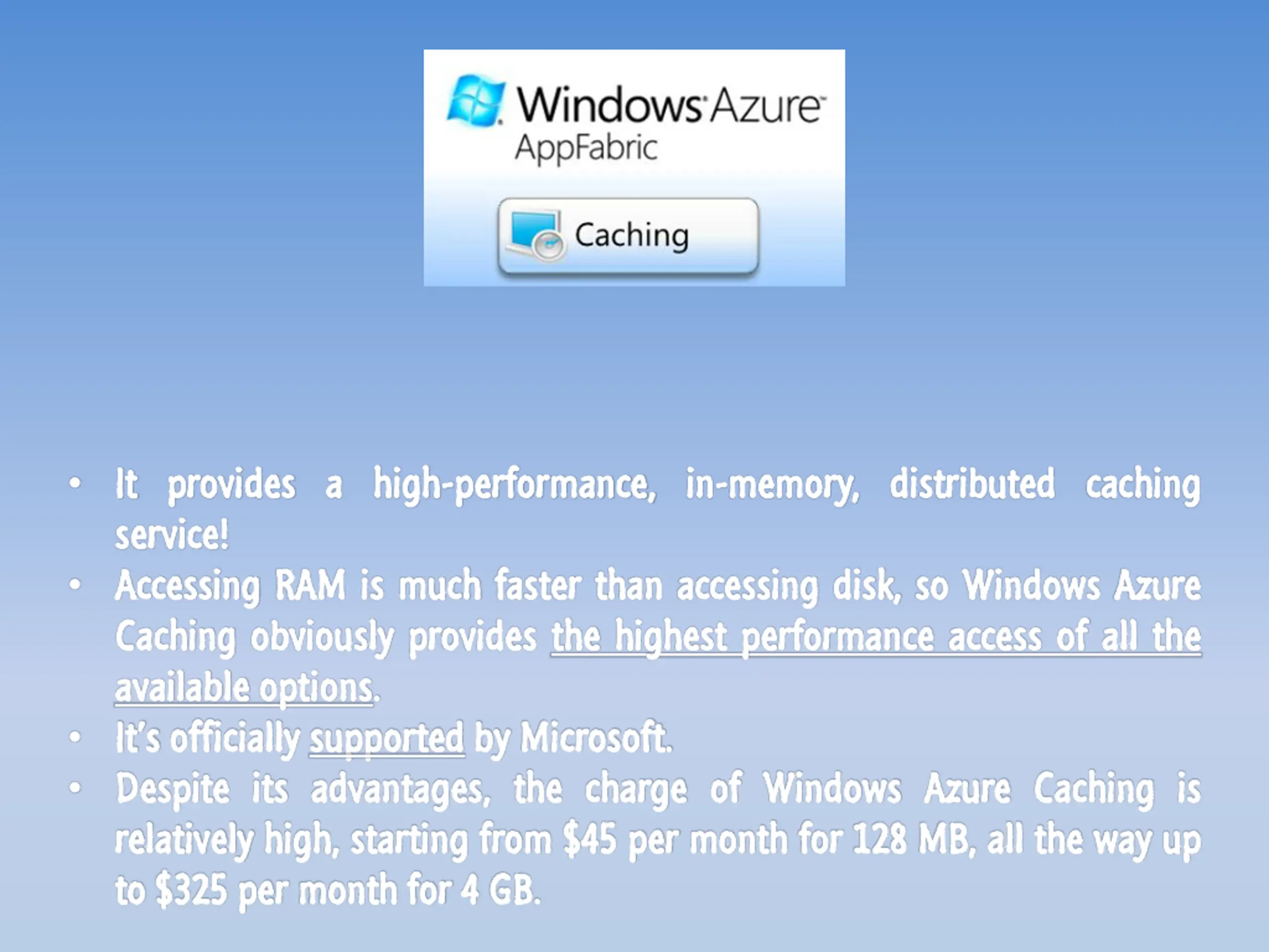 It It provides provides a a high service! service! Accessing Accessing RAM Caching Caching obviously obviously provides available available options options.. It s It s officially officially supported Despite Despite its its advantages, relatively relatively high, high, starting to to $ $325 325 per per month month for high- -performance, performance, in in- -memory, memory, distributed distributed caching caching RAM is is much much faster provides the faster than the highest than accessing accessing disk, highest performance performance access disk, so so Windows Windows Azure access of of all all the Azure the supported by by Microsoft advantages, the starting from from $ $45 45 per for 4 4 GB GB.. Microsoft.. the charge charge of of Windows per month month for Windows Azure for 128 128 MB, Azure Caching Caching is is MB, all all the the way way up up