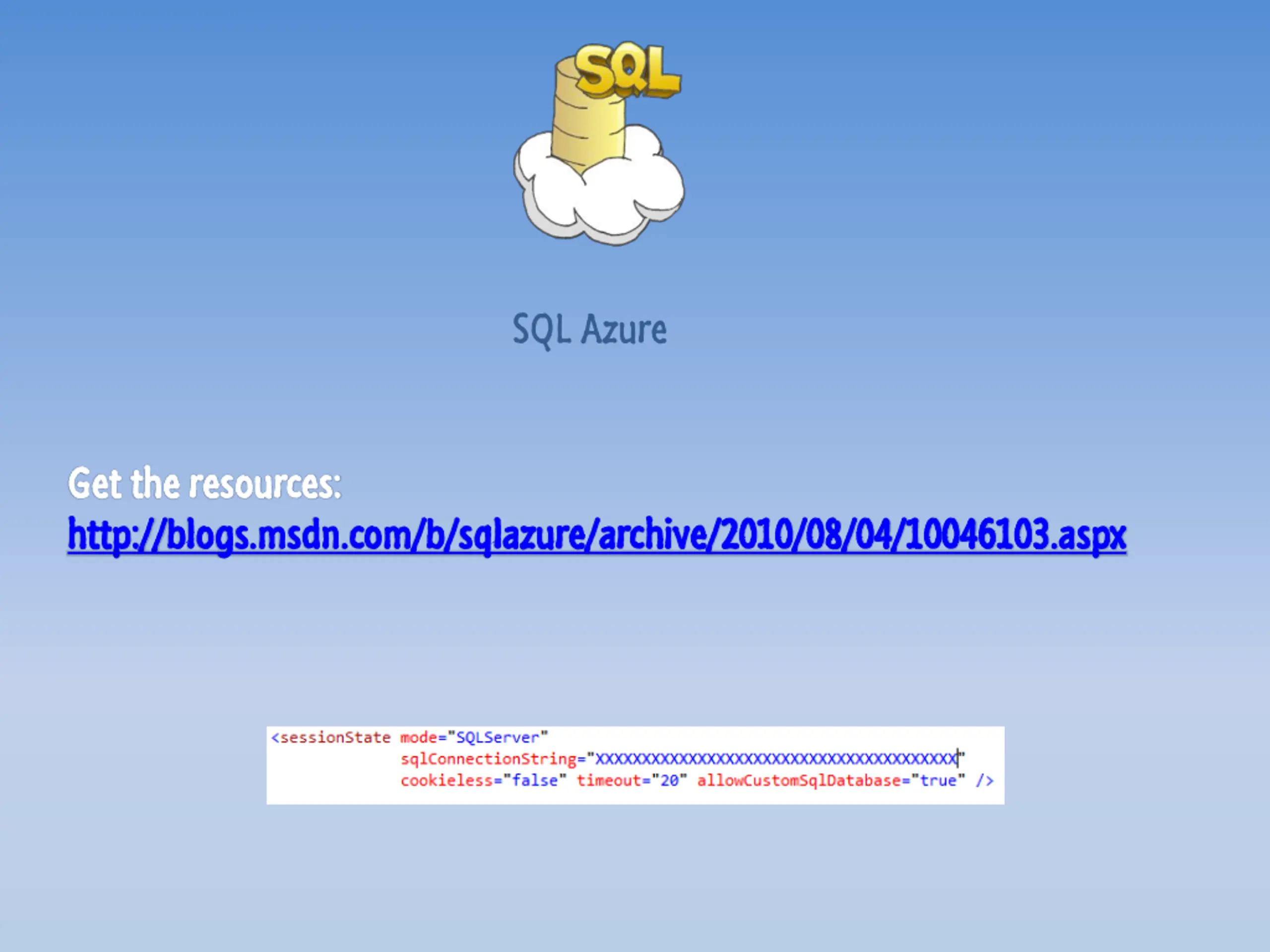 SQL Azure Get Get the resources: the resources: http:// http://blogs.msdn.com/b/sqlazure/archive/2010/08/04/10046103.aspx blogs.msdn.com/b/sqlazure/archive/2010/08/04/10046103.aspx