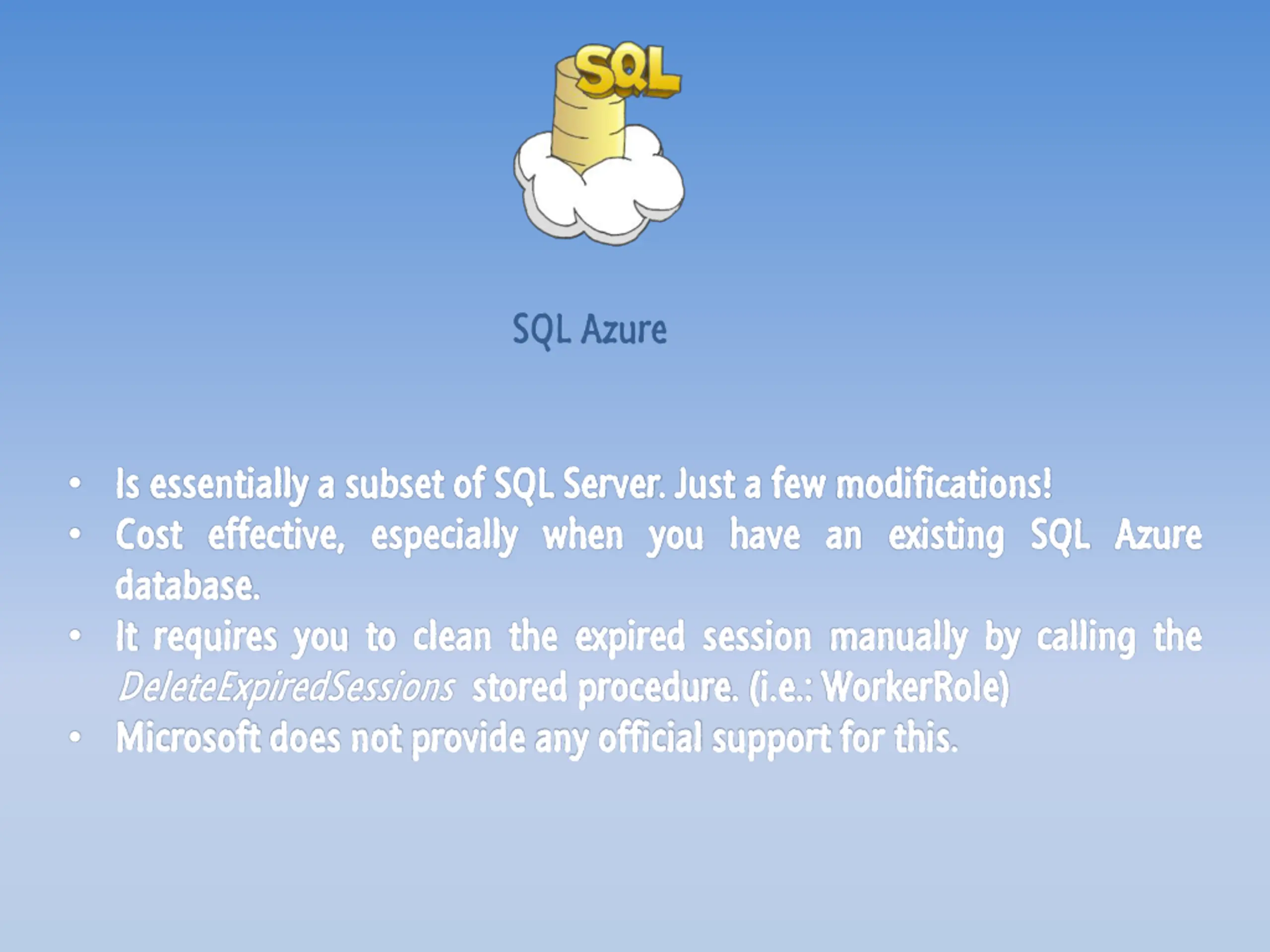 SQL Azure Is Is essentially essentially a a subset Cost Cost effective, effective, especially database database.. It It requires requires you DeleteExpiredSessions stored Microsoft Microsoft does does not subset of of SQL especially when SQL Server Server.. Just when you Just a a few you have have an an existing few modifications modifications! ! existing SQL SQL Azure Azure you to to clean clean the stored procedure not provide provide any any official the expired expired session procedure.. (i (i..e e.: .: WorkerRole official support support for session manually manually by by calling WorkerRole) ) for this this.. calling the the