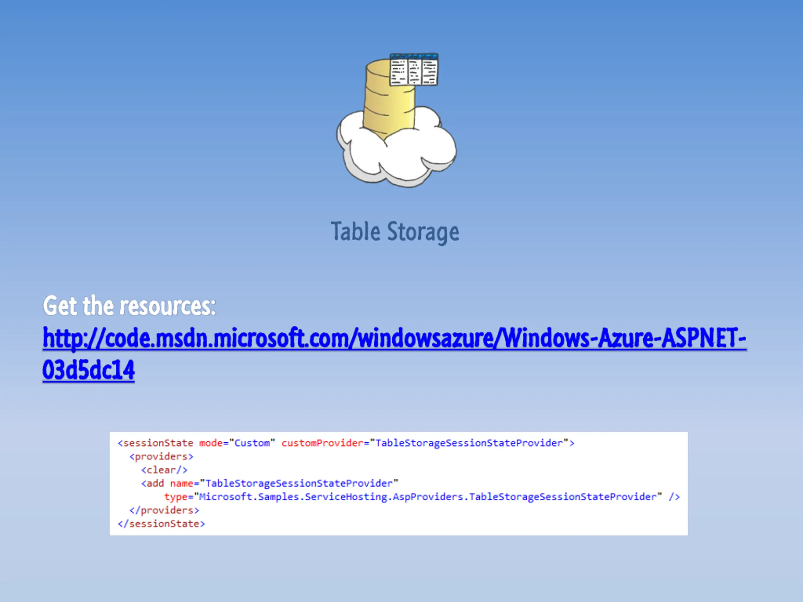 Table Storage Get Get the resources: the resources: http:// http://code.msdn.microsoft.com/windowsazure/Windows code.msdn.microsoft.com/windowsazure/Windows- -Azure 03d5dc14 03d5dc14 Azure- -ASPNET ASPNET- -