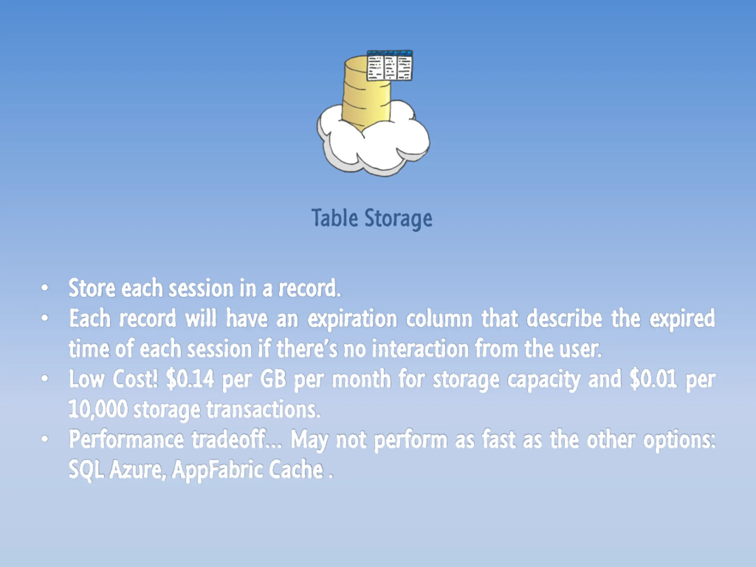 Table Storage Store Store each Each Each record time time of of each Low Low Cost! 10 10,,000 000 storage Performance Performance tradeoff SQL SQL Azure, Azure, AppFabric each session session in in a a record record will will have have an an expiration each session session if if there s Cost! $ $0 0..14 14 per per GB storage transactions transactions.. tradeoff May AppFabric Cache record.. expiration column there s no no interaction interaction from GB per per month month for that describe describe the from the the user for storage storage capacity capacity and column that the expired expired user.. and $ $0 0..01 01 per per May not Cache .. not perform perform as as fast fast as as the the other other options options::