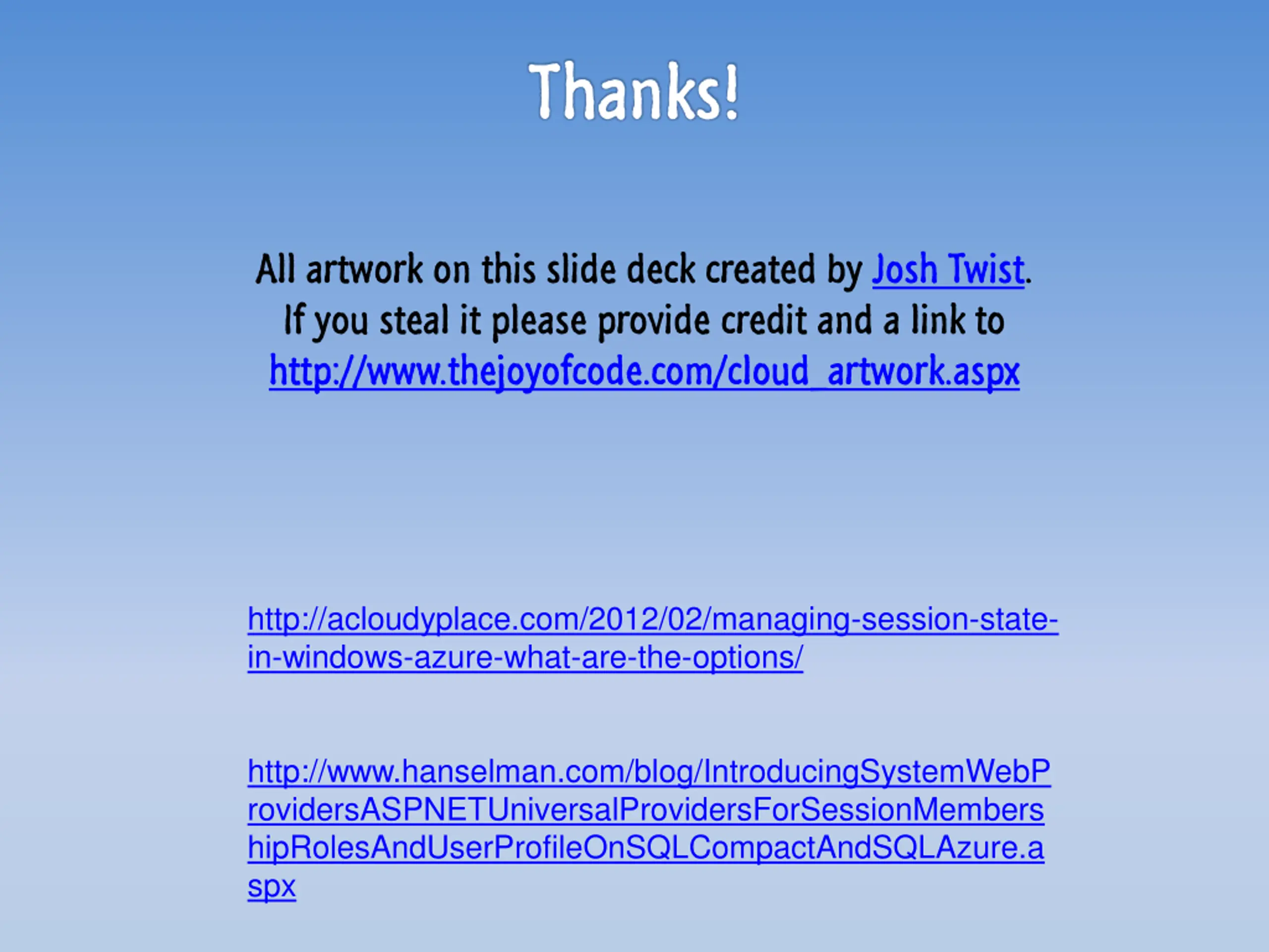 Thanks! All artwork on this slide deck created by Josh Twist. If you steal it please provide credit and a link to http://www.thejoyofcode.com/cloud_artwork.aspx http://acloudyplace.com/2012/02/managing-session-state- in-windows-azure-what-are-the-options/ http://www.hanselman.com/blog/IntroducingSystemWebP rovidersASPNETUniversalProvidersForSessionMembers hipRolesAndUserProfileOnSQLCompactAndSQLAzure.a spx