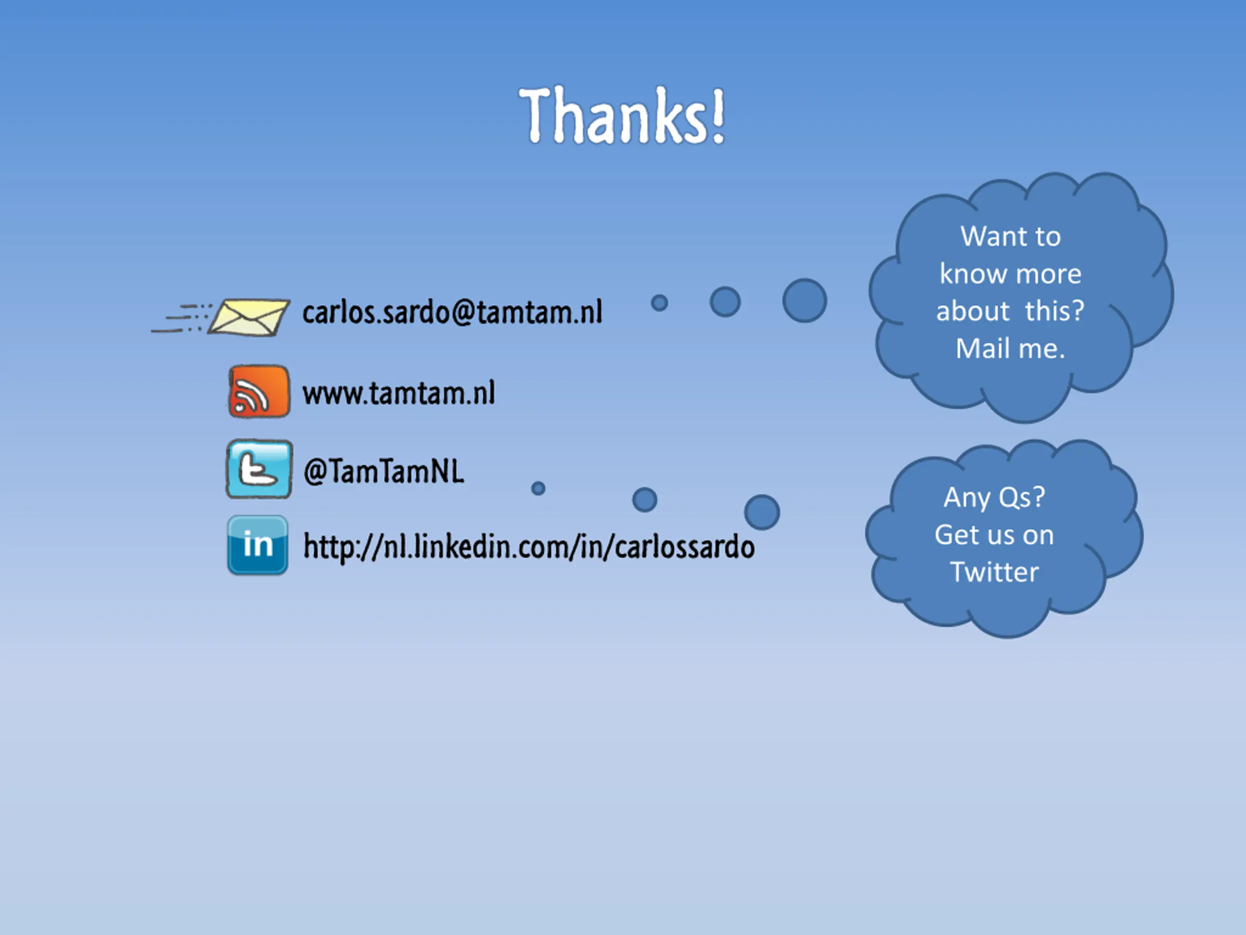 Thanks! Want to know more about this? Mail me. carlos.sardo@tamtam.nl www.tamtam.nl @TamTamNL Any Qs? Get us on Twitter http://nl.linkedin.com/in/carlossardo