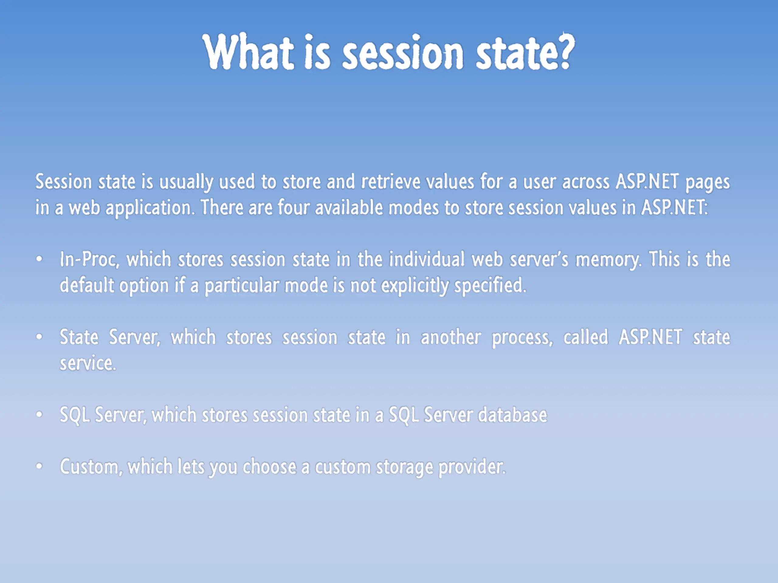 What What is is session session state state? ? Session state is usually used to store and retrieve values for a user across ASP.NET pages in a web application. There are four available modes to store session values in ASP.NET: In-Proc, which stores session state in the individual web server s memory. This is the default option if a particular mode is not explicitly specified. State Server, which stores session state in another process, called ASP.NET state service. SQL Server, which stores session state in a SQL Server database Custom, which lets you choose a custom storage provider.