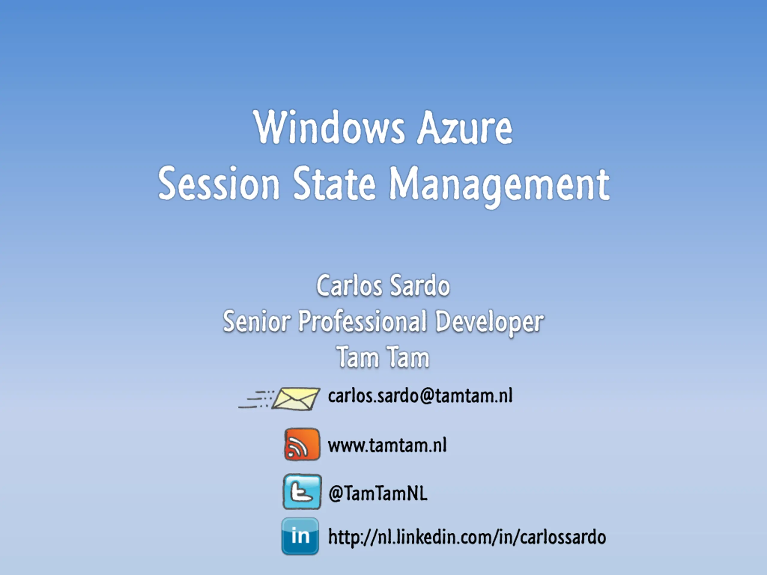 Windows Azure Session State Management Carlos Sardo Senior Professional Developer Tam Tam carlos.sardo@tamtam.nl www.tamtam.nl @TamTamNL http://nl.linkedin.com/in/carlossardo