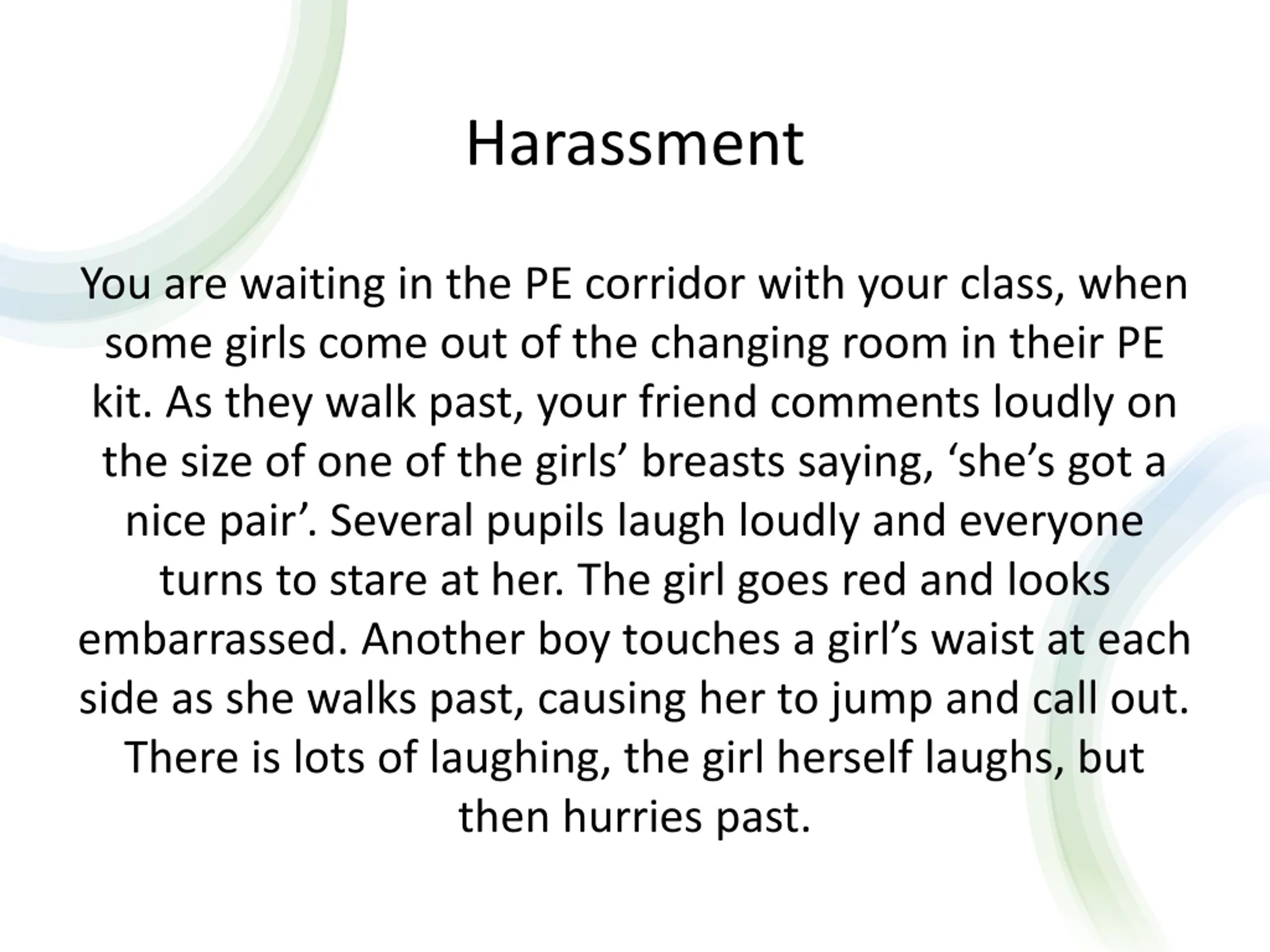 Harassment You are waiting in the PE corridor with your class, when some girls come out of the changing room in their PE kit. As they walk past, your friend comments loudly on the size of one of the girls breasts saying, she s got a nice pair . Several pupils laugh loudly and everyone turns to stare at her. The girl goes red and looks embarrassed. Another boy touches a girl s waist at each side as she walks past, causing her to jump and call out. There is lots of laughing, the girl herself laughs, but then hurries past.