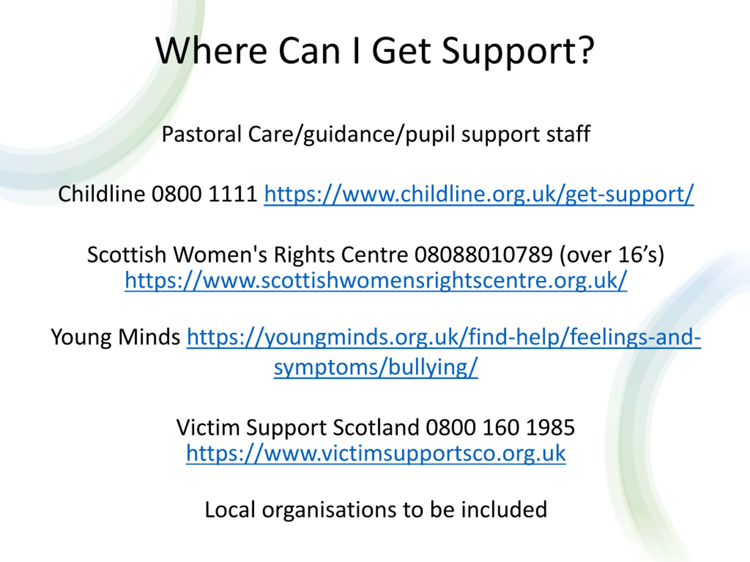 Where Can I Get Support? Pastoral Care/guidance/pupil support staff Childline 0800 1111 https://www.childline.org.uk/get-support/ Scottish Women's Rights Centre 08088010789 (over 16 s) https://www.scottishwomensrightscentre.org.uk/ Young Minds https://youngminds.org.uk/find-help/feelings-and- symptoms/bullying/ Victim Support Scotland 0800 160 1985 https://www.victimsupportsco.org.uk Local organisations to be included