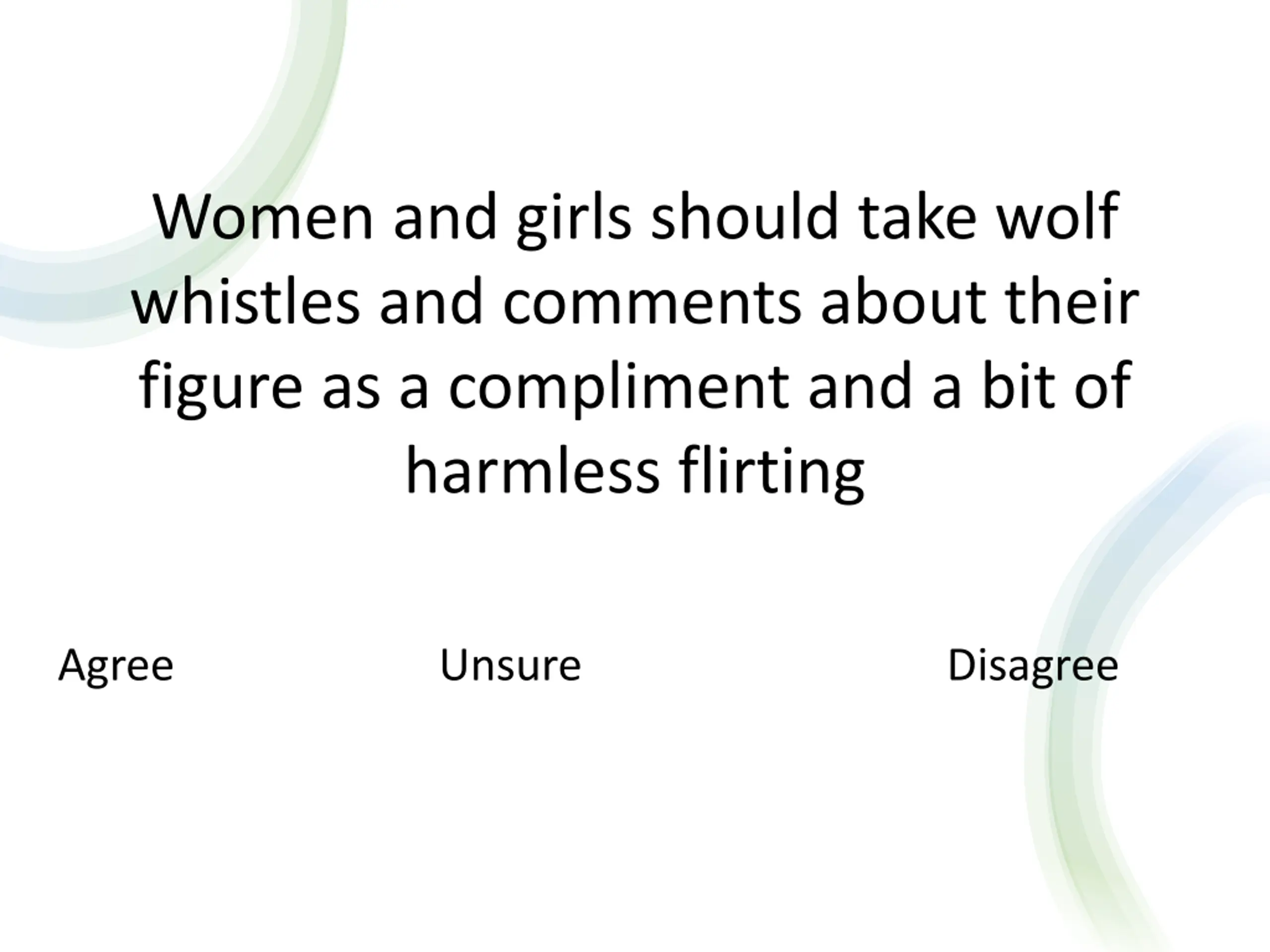 Women and girls should take wolf whistles and comments about their figure as a compliment and a bit of harmless flirting Agree Unsure Disagree