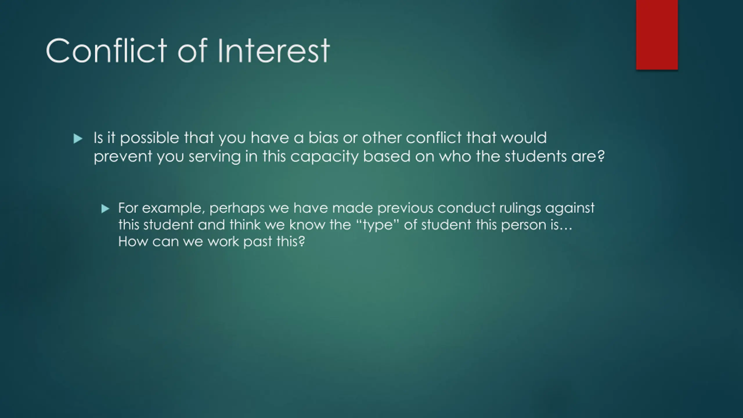 Conflict of Interest Is it possible that you have a bias or other conflict that would prevent you serving in this capacity based on who the students are? For example, perhaps we have made previous conduct rulings against this student and think we know the type of student this person is How can we work past this?