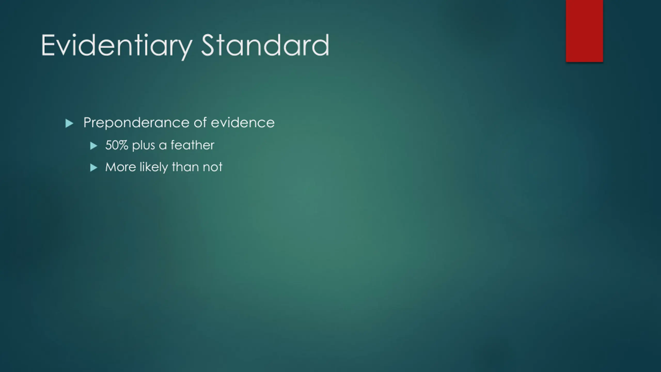 Evidentiary Standard Preponderance of evidence 50% plus a feather More likely than not