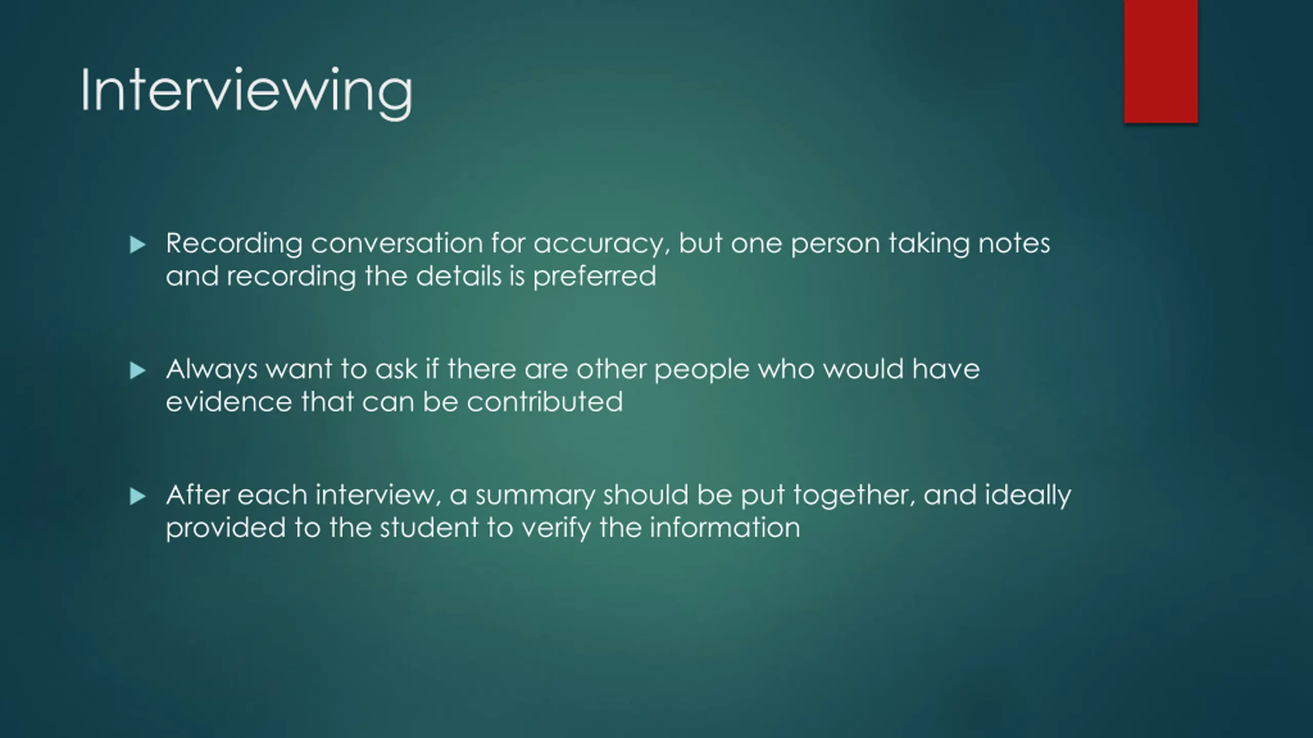 Interviewing Recording conversation for accuracy, but one person taking notes and recording the details is preferred Always want to ask if there are other people who would have evidence that can be contributed After each interview, a summary should be put together, and ideally provided to the student to verify the information