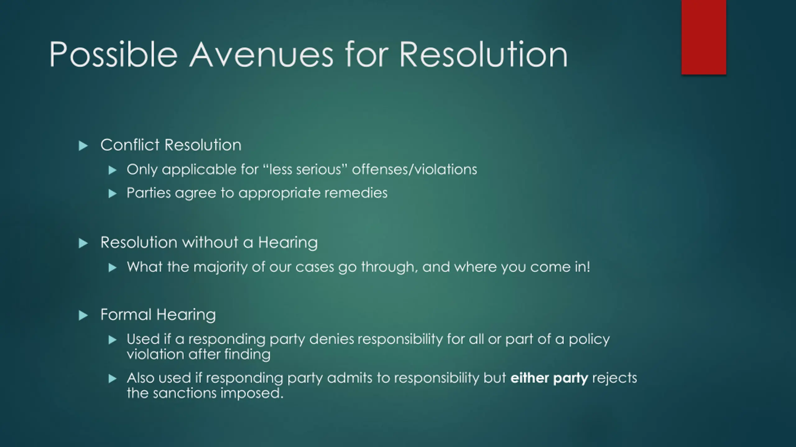 Possible Avenues for Resolution Conflict Resolution Only applicable for less serious offenses/violations Parties agree to appropriate remedies Resolution without a Hearing What the majority of our cases go through, and where you come in! Formal Hearing Used if a responding party denies responsibility for all or part of a policy violation after finding Also used if responding party admits to responsibility but either party rejects the sanctions imposed.
